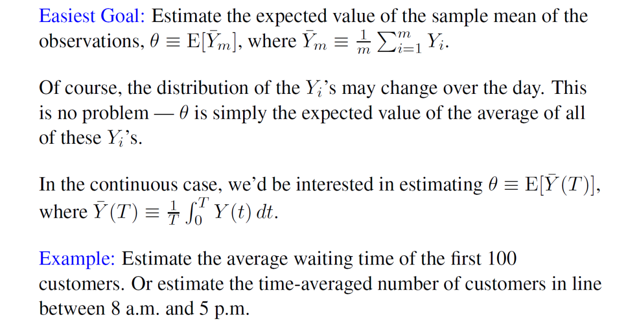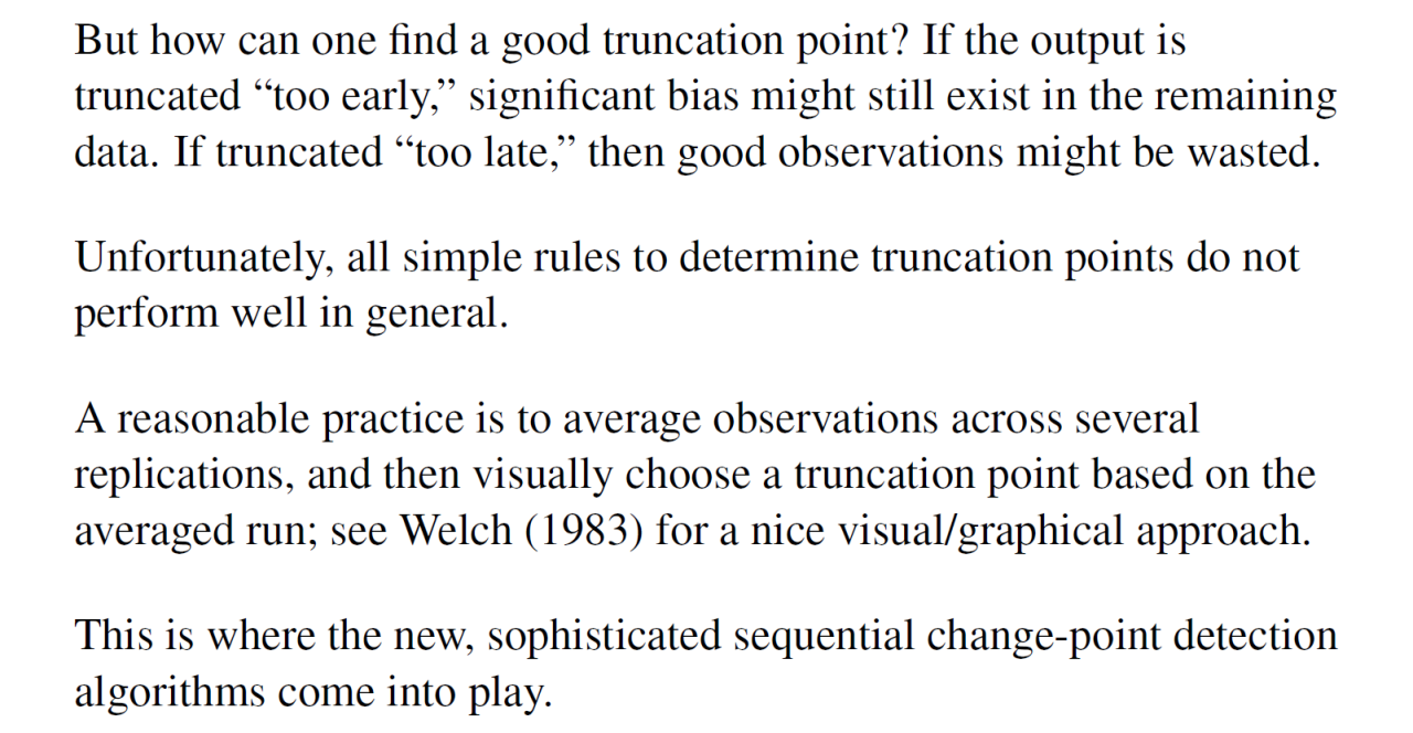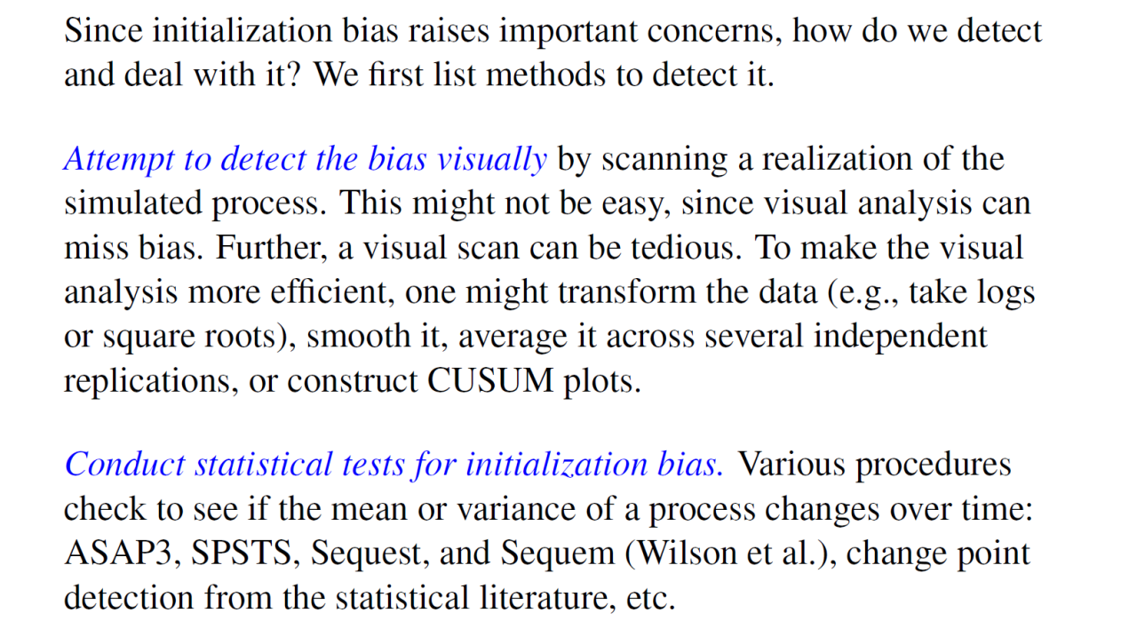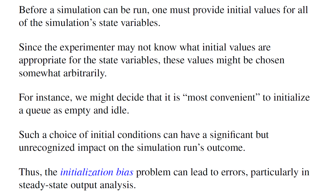 输出结果分析的难点在于样本之间往往是不满足独立同分布假定的。以排队问题为例,相邻用户之间的等待时间显然是相互关联的。在这种情况下之间套用一些常用的估计方法会导致额外偏差。