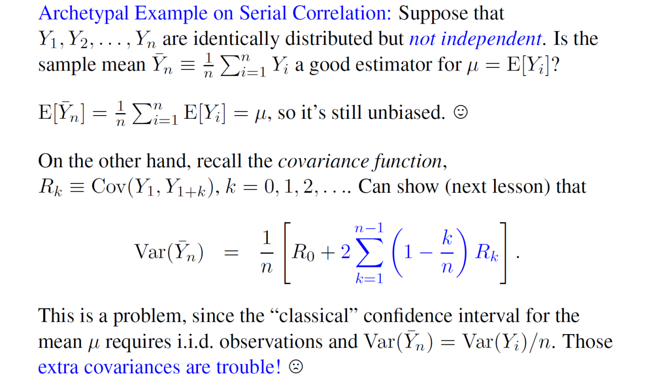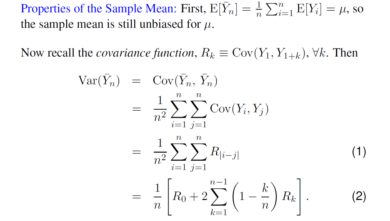 其中,最简单的任务是使用样本均值来估计观测的结果。但需要注意的是由于样本之间不是独立同分布的,我们不能直接使用样本方差来来估计总体的方差。