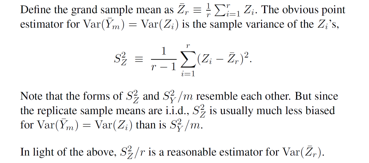 通过独立重复试验,我们可以得到满足独立同分布假定的观测均值$Z_i$,此时就可以使用标准的参数估计方法来估计总体方差了。