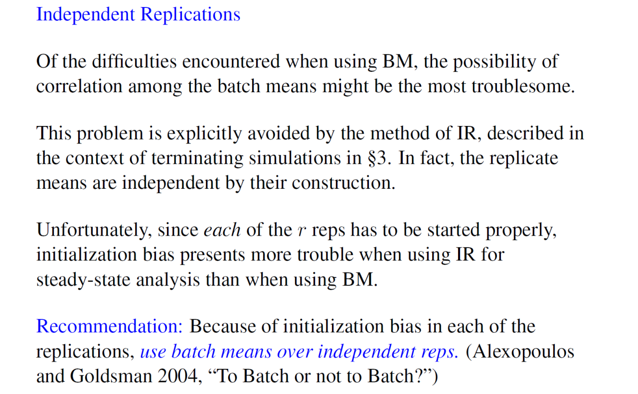 batch means并不是steady-state analysis的唯一方法,实际上有些方法有着更好的性质。比如说我们可以把独立重复试验应用在steady-state analysis中,然后在每次试验时再进行batch mean来获得更稳定的估计。
