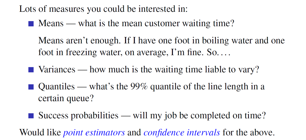 对随机输出结果进行分析的常用指标包括均值、方差、分位数等,同时我们也会使用点估计或是置信区间的方法来进行分析。