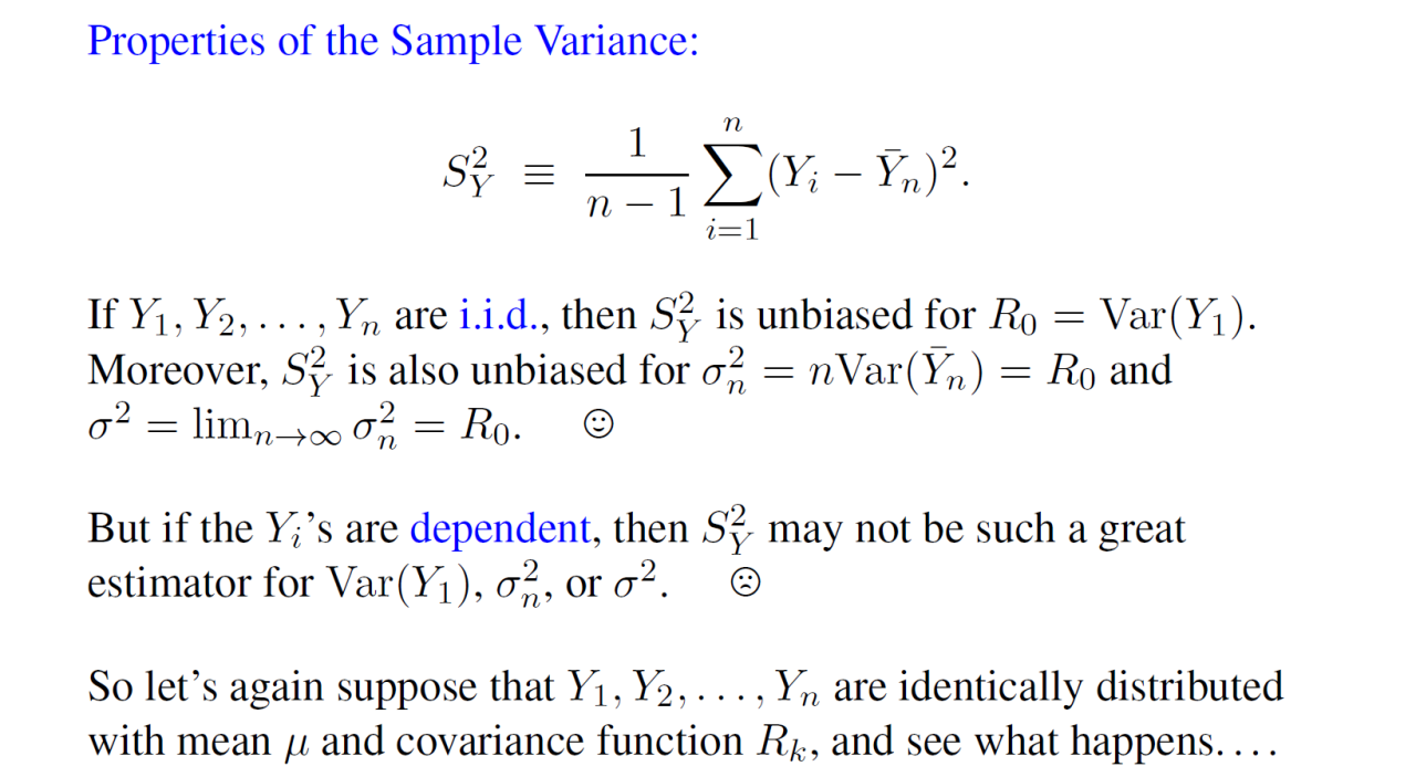 当我们使用样本均值对分布的其它参数进行估计时,样本之间的相关性同样会产生巨大的影响。以样本方差为例,如果我们直接套用独立同分布条件下的样本方差公式则会导致样本方差的期望远小于样本均值的方差。