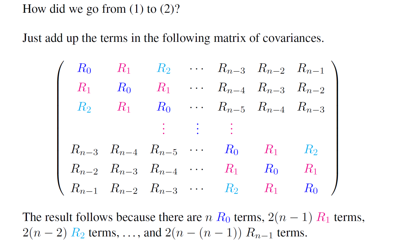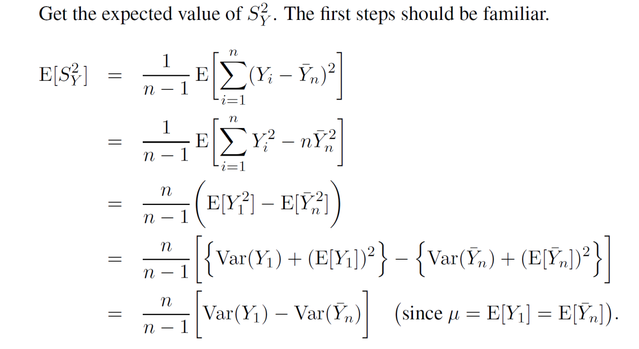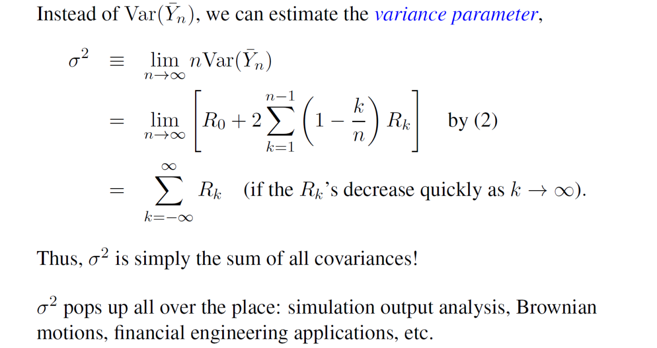 在这种情况下样本均值$E[\bar{Y}_n]$仍然等于分布的均值$\mu$,我们考虑它的方差可以得到如下公式: