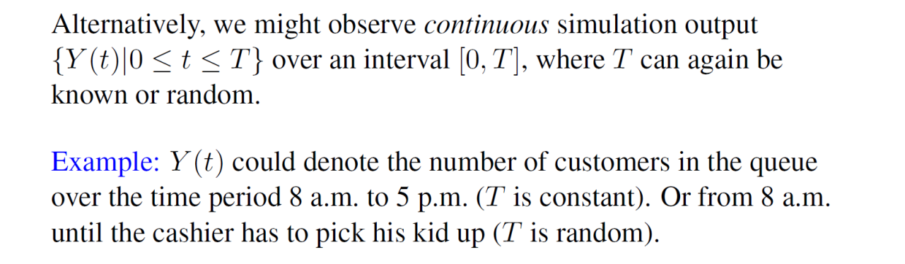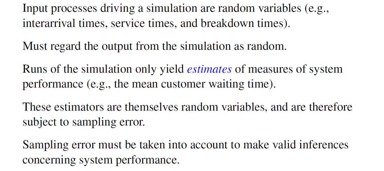 对输出结果进行分析的原因之一在于我们在进行模拟时的输入是随机的,因此系统的输出也必然是随机变量。这样就需要考虑采样误差对于系统输出结果的影响。