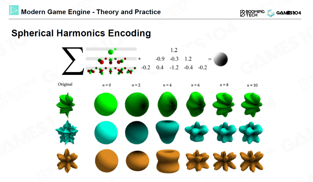 基于SH我们可以对场景中任意点接收到的环境光照进行分解,一般来说只需要使用1-2阶的低频信号就可以实现合理的渲染效果。