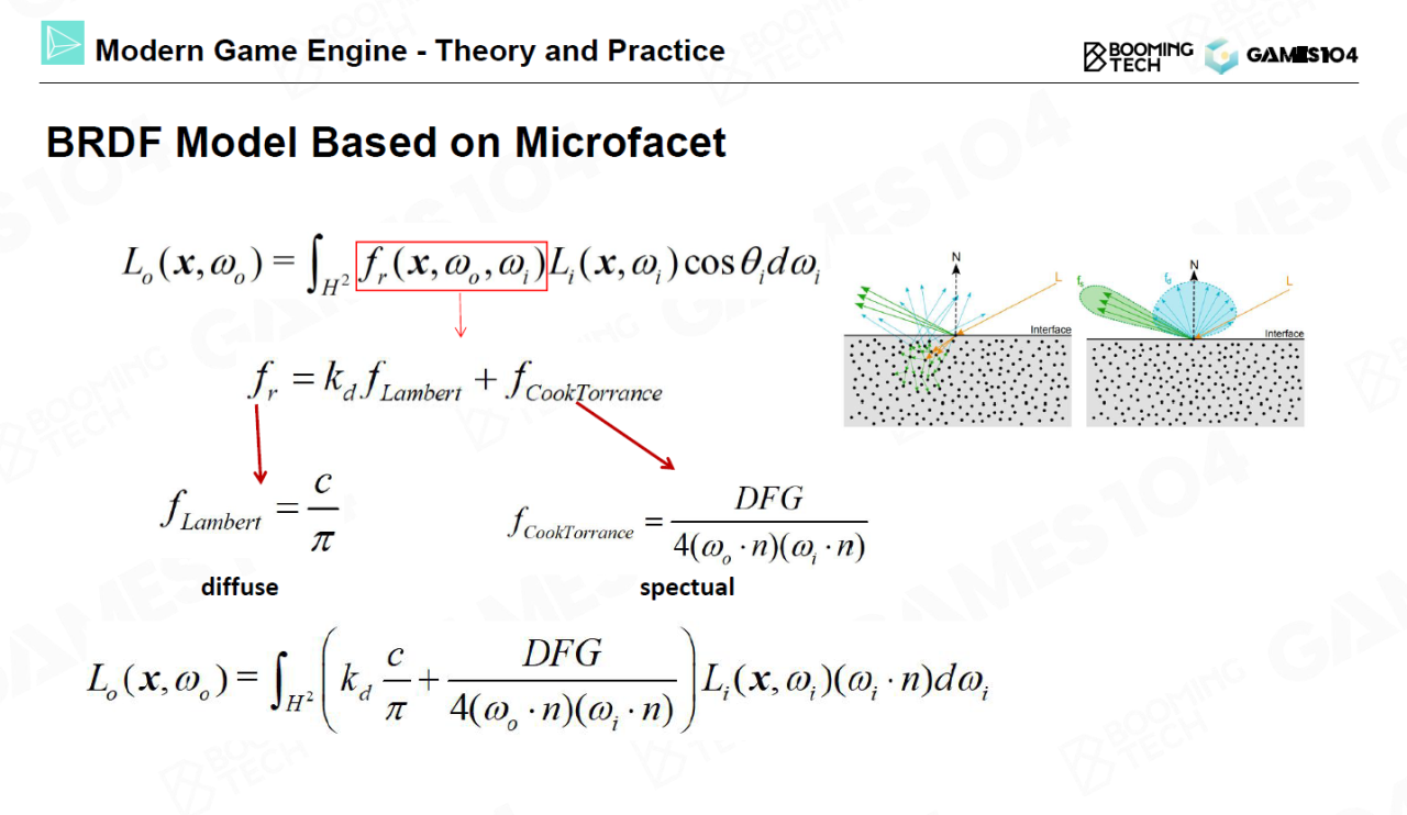 光线在物体表面上的反射可以分解为体反射(body reflection)和表面反射(surface reflection)两种。在体反射中光子会进入到物体的内部进行反射然后从物体表面的另一个点射出;而在表面反射中光子则会直接被反射出去。实际上物体表面的漫反射行为对应着体反射,我们可以使用Lambert模型进行表示;而表面反射的行为则可以基于微表面理论使用Cook-Torrance模型来进行表达。将二者组合到一起就构成来材质的BRDF。