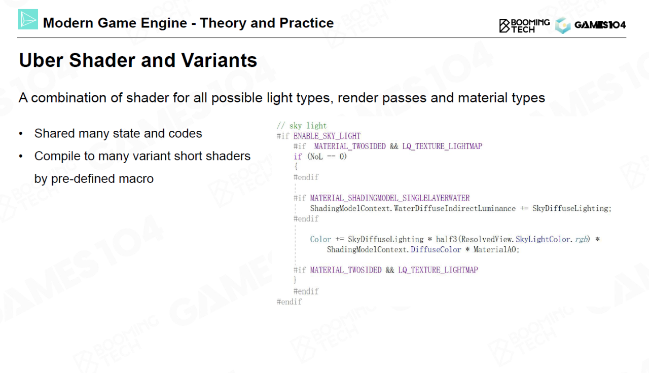 这些大量的shader一方面来自于美术对场景和角色的设计,另一方面不同材质在不同光照条件下的反应也使得程序员需要将不同情况下的shader组合到一起,并通过宏的方式让程序自行选择需要执行的代码。