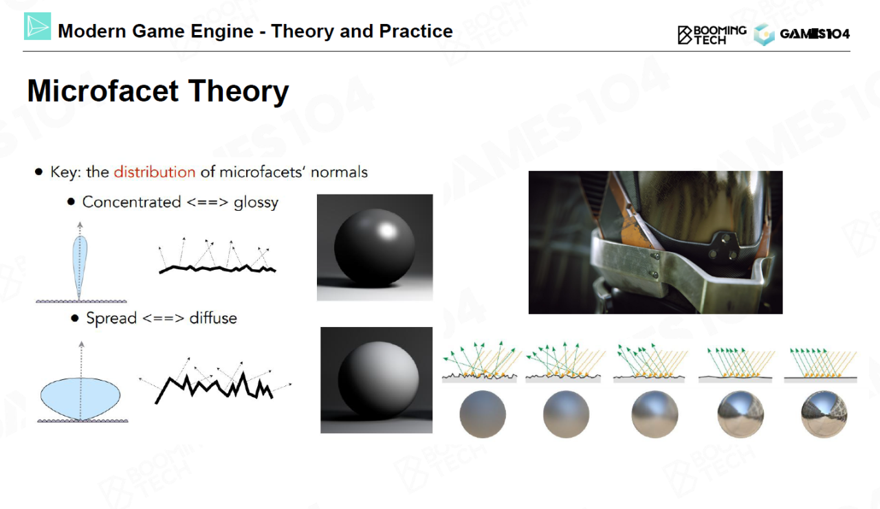 有了光照后我们来考虑材质。基于物理的材质模型大量使用了微表面理论(microfacet theory)来模拟现实世界中材质,简单来说微表面理论认为材质的表面是由大量方向各异的光滑镜面组成,这些镜面的分布控制了不同材质的反射行为。