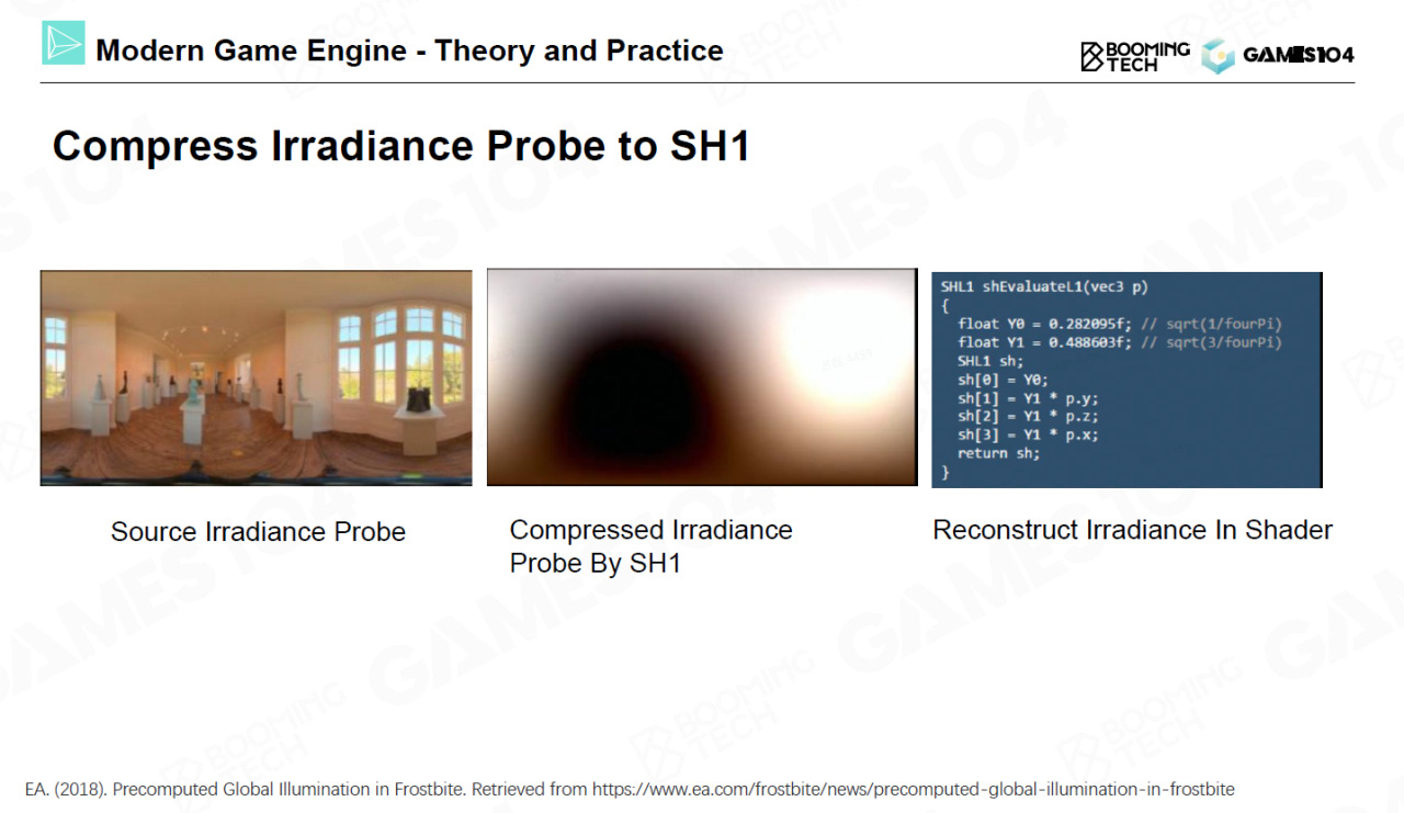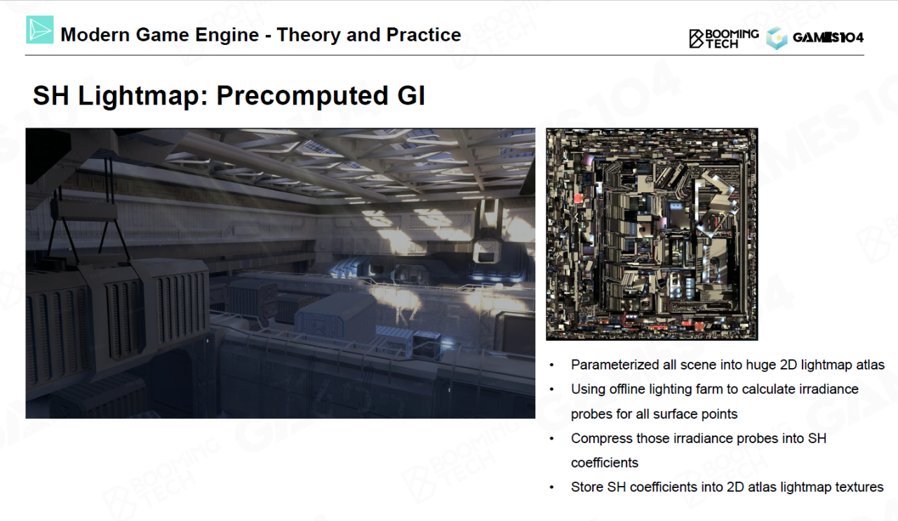 lightmap正是基于这种思想而提出来的光照技术。我们可以将场景中每个点的光照离线烘焙到一张纹理图上,然后在渲染时读取纹理值来获得SH表达的环境光照。