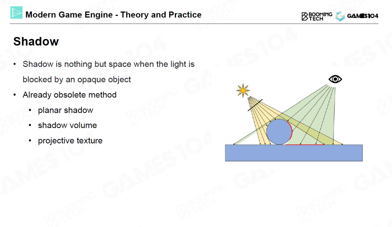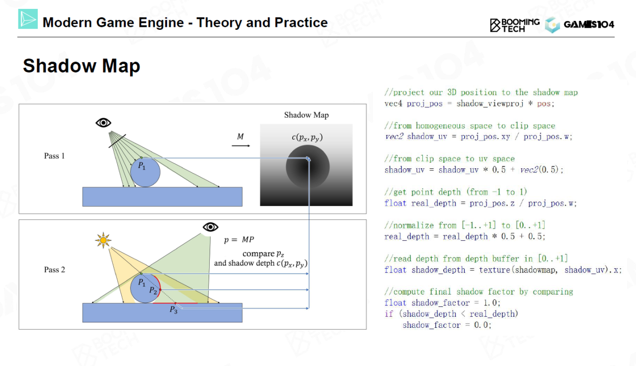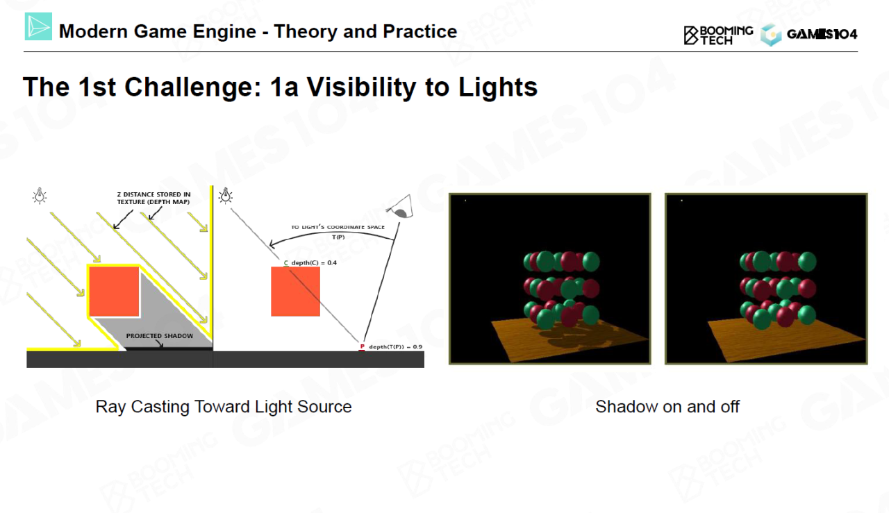 对于阴影问题,早期的处理方法主要是shadow volume,而现代游戏引擎的主流方法则是shadow map。shadow map的处理流程是在光源位置设置一个新的相机并渲染出一张深度图,然后在实际相机进行渲染时对每个点检测它到光源处的深度。如果该深度大于深度图对应位置处的深度则说明该点对于光源是不可见的,即位于阴影中。