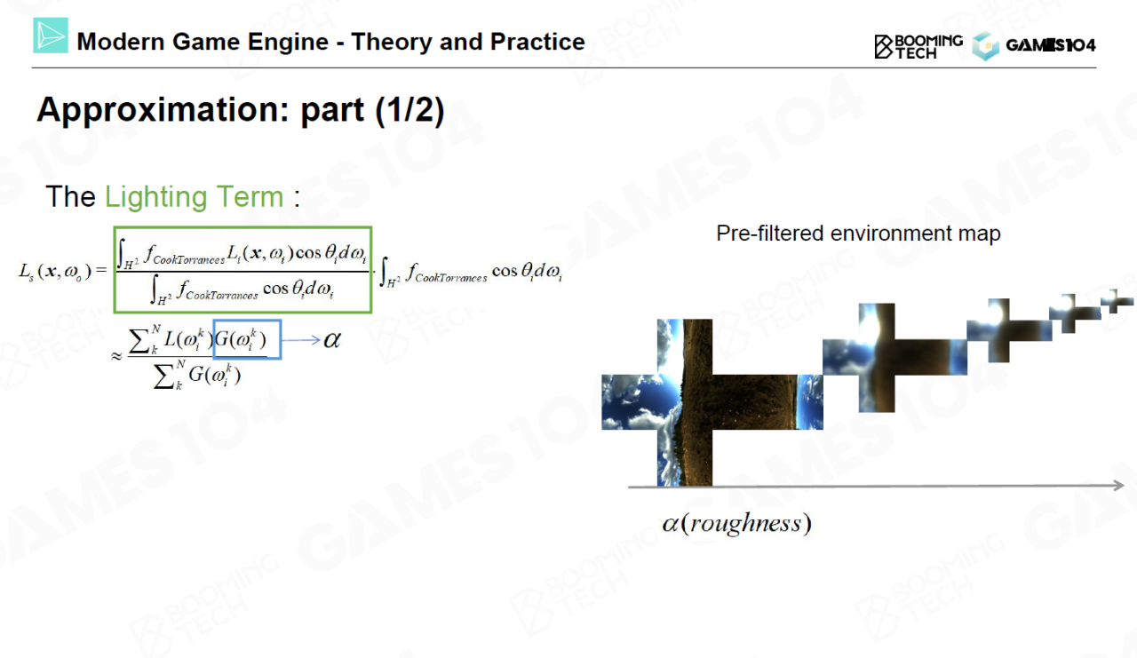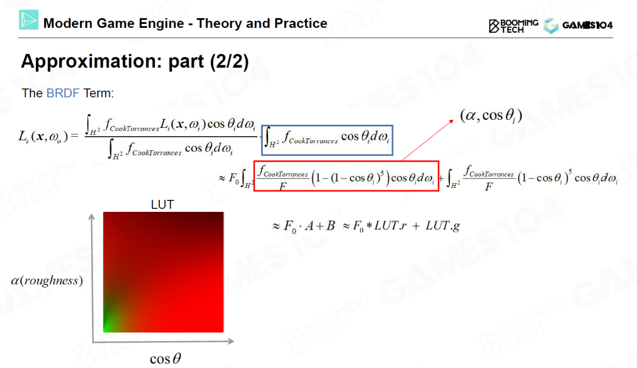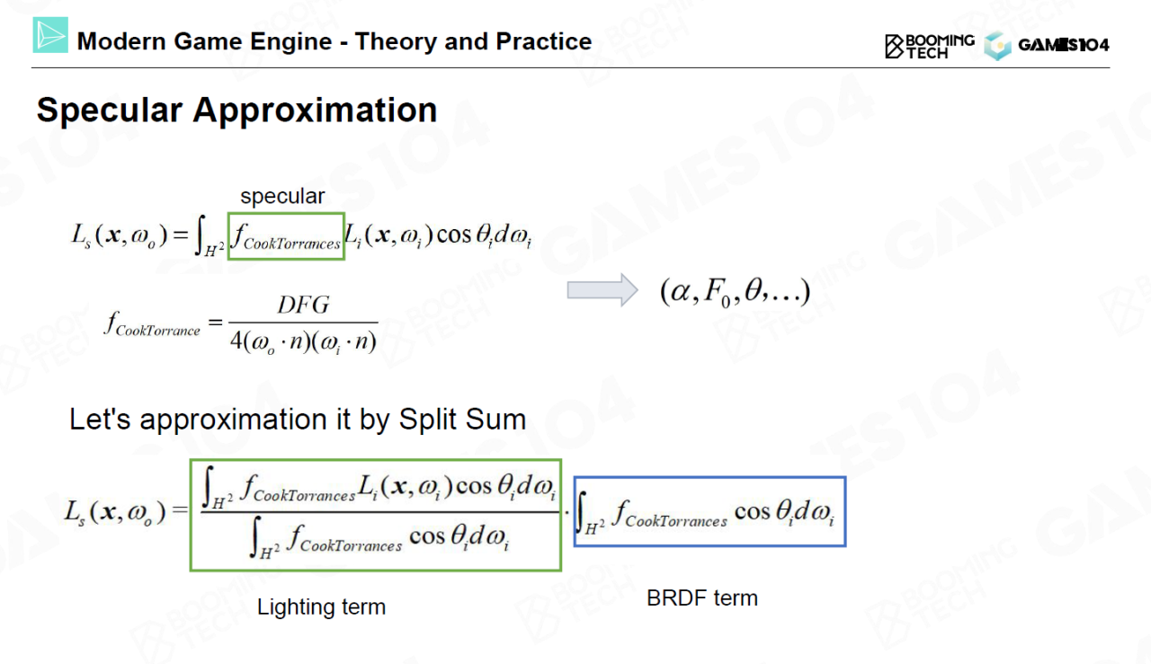 对镜面反射的处理要相对复杂一些。我们首先需要将镜面反射的积分利用split-sum拆分成光照项(lighting term)和BRDF项(BRDF term)两部分,而这两项都可以通过预计算的方法事先存储在一个表格中。
