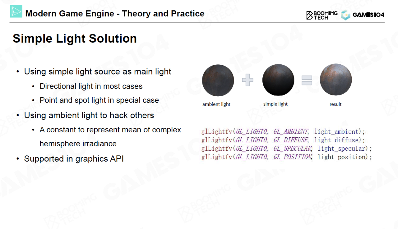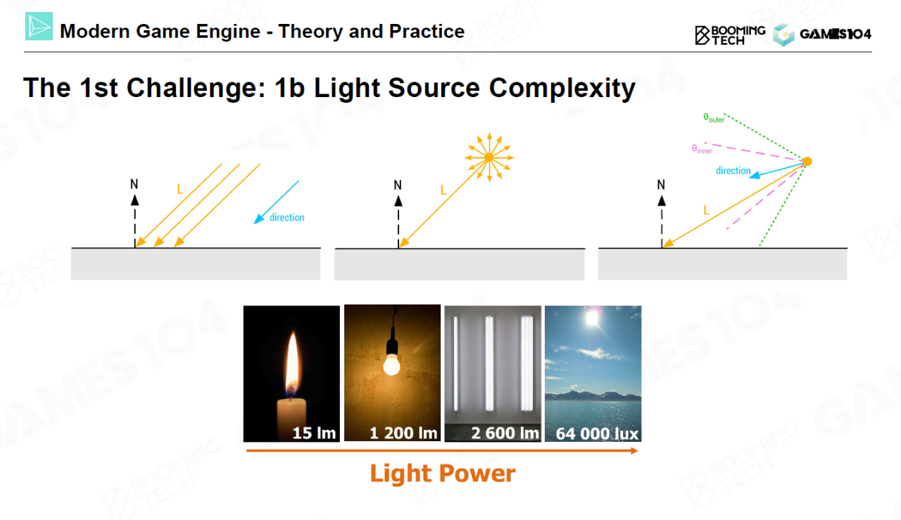 其次,场景中往往有着各种类型的光源需要考虑。常见的光源形式包括平行光、点光源、聚光灯、面光源等等。