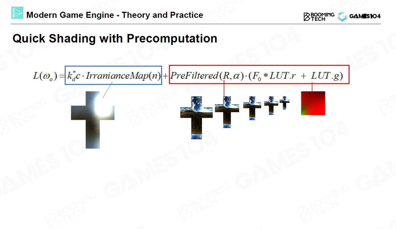 对于漫反射项比较简单,我们首先通过预计算的方法对环境光照按照余弦进行积分,接着把积分后的值存储在一个表格中。实际渲染时进行查表并和漫反射系数进行相乘即可。