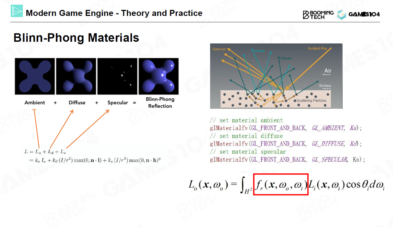 有了光照后我们开始考虑材质。最经典的材质模型是Blinn-Phong材质(Blinn-Phong materials),它把材质的反射行为分解为与方向无关的环境光、与入射和观察角度有关的漫反射以及高光。