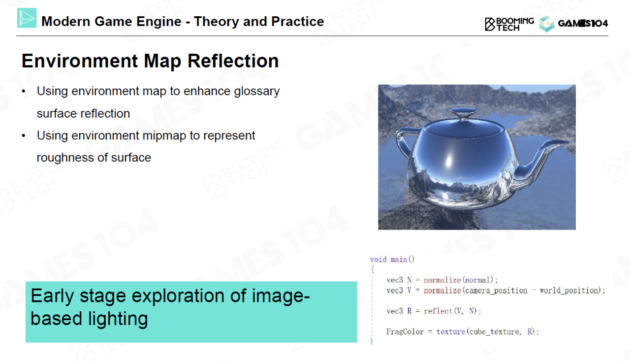 为了更好地模拟环境光照,我们可以使用环境贴图技术把环境光存储在一个立方体表面上。这样当需要计算入射光线时只要根据方向去进行查询即可。