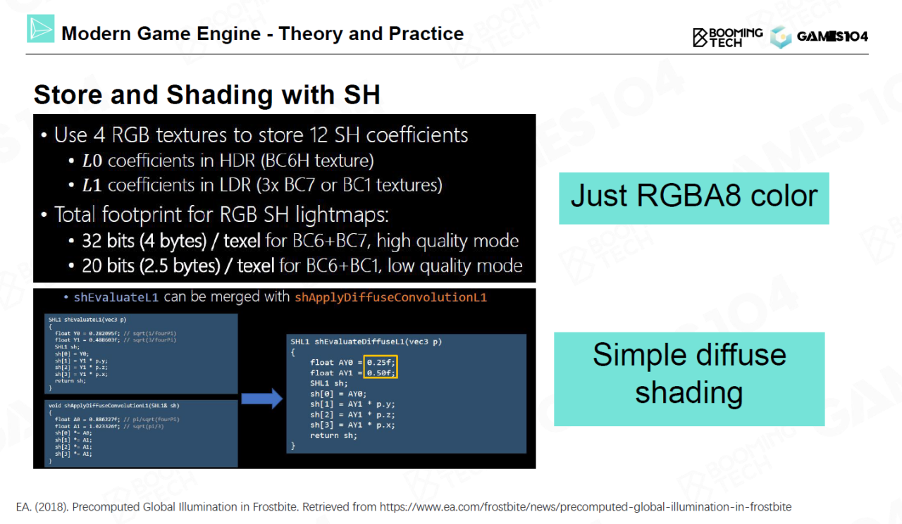 假设我们使用2阶的SH对环境光照进行分解,在RGB3个通道上只需要12个参数即可表示任意点接收到的环境光。进行存储时可以对不同的系数使用不同的精度进行存储,这样任意点的环境光照可以使用RGBA的32bits来表示,换句话说每一点的光场相当于RGBA纹理图像上的一个像素。