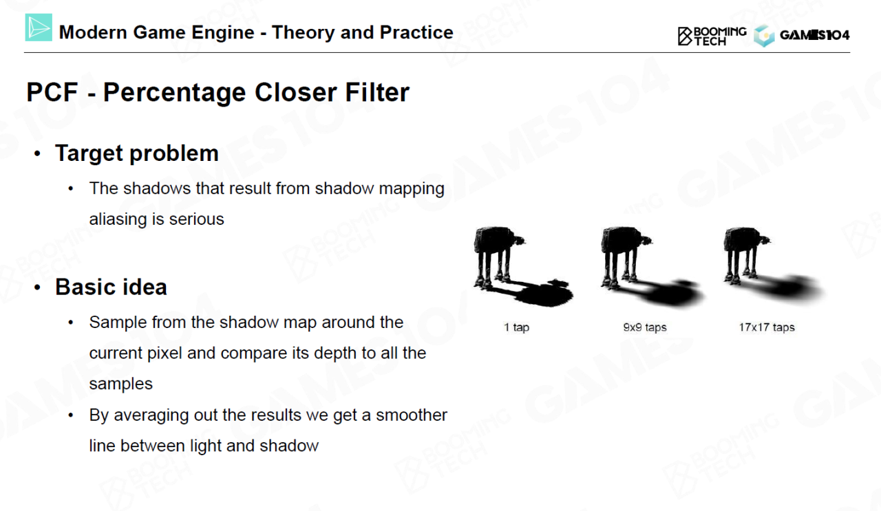 现代实时渲染中会更多地使用PCF和PCSS等算法,它们的特点是可以实现更加自然的软阴影效果。