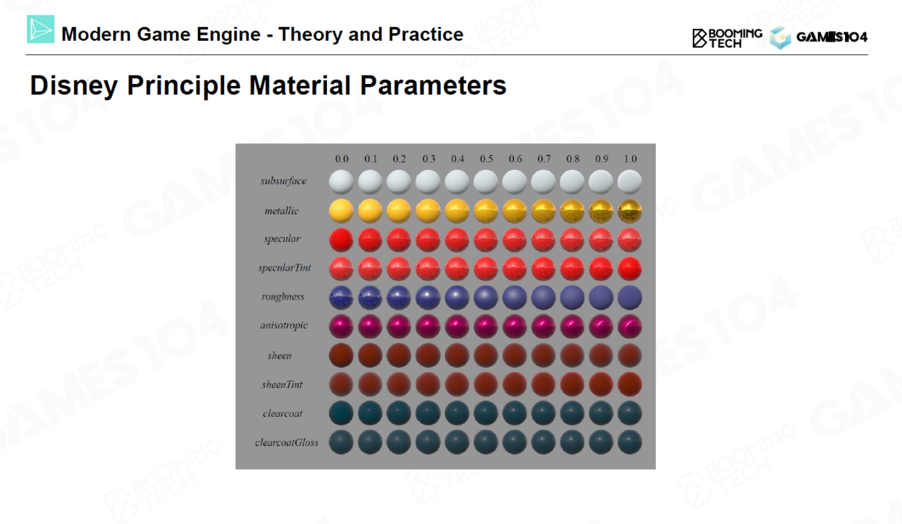 为了方便不同背景的从业者进行使用,Disney提出了著名的Disney Principled BRDF来设计不同的材质模型。它的思想是设计材质模型时要尽可能方便艺术家进行理解,而不要过多地使用物理上面的概念。