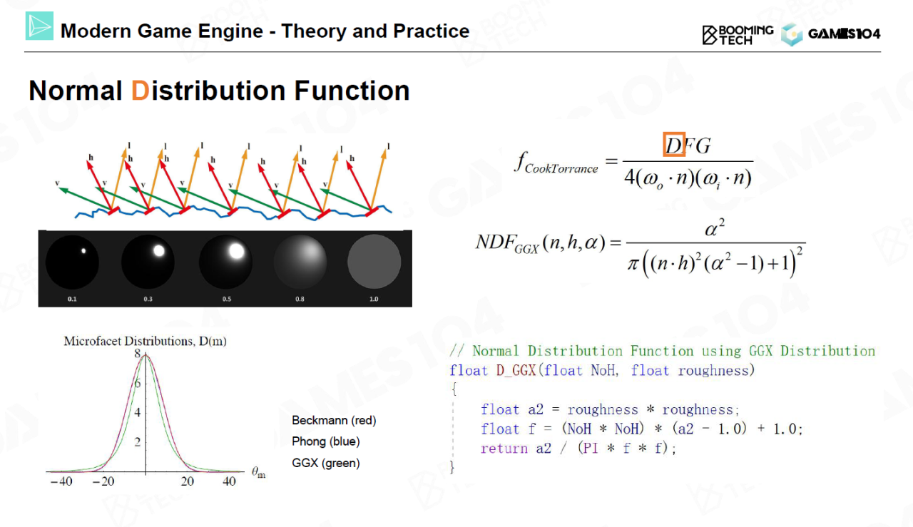 Cook-Torrance模型可以拆分为三项。首先是法向分布函数(normal distribution function),它表示材质不同方向上镜面法向的分布情况。法向分布函数包含一个参数$\alpha$来表示表面的粗糙度,$\alpha$越大表示表面越粗糙反射行为越接近漫反射,$\alpha$越小表示表面越光滑反射行为越接近理想镜面反射。