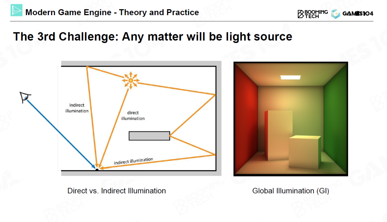 最后,在渲染时需要考虑光线在场景中不断反射的行为。全局光照一直是渲染的终极目标。