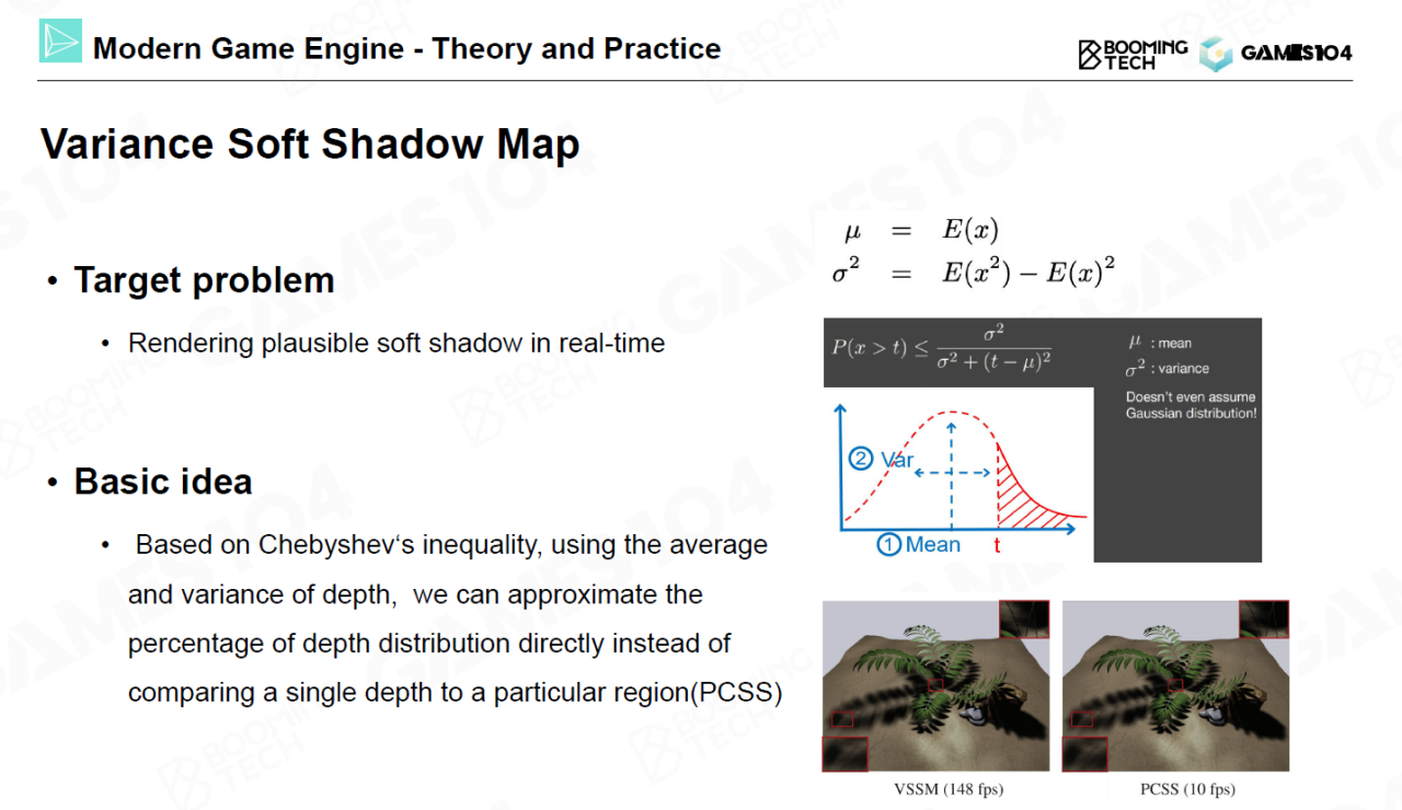另一种生成软阴影的方法是VSSM,它基于Chebyshev不等式来估计像素上的阴影比例。