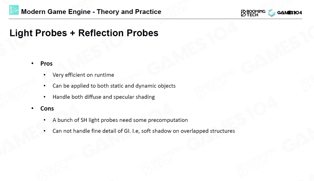 除了lightmap外还可以在空间上设置一些探针(probe)来记录环境光照,而在计算物体的着色时只需要对附近probe进行插值即可估计该点的光照。