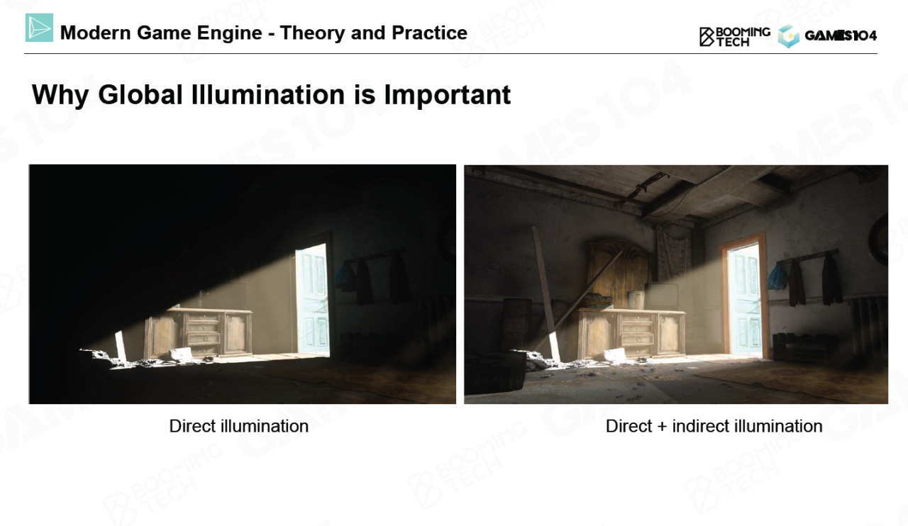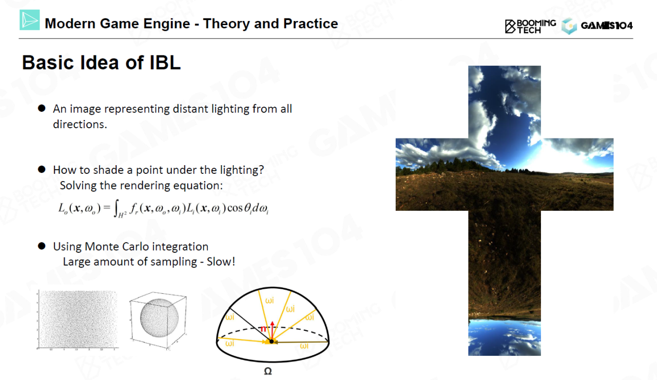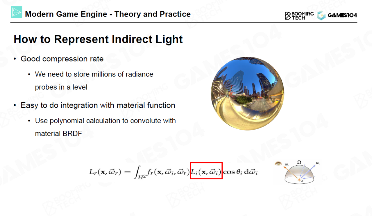 全局光照可以显著地提升画面的渲染效果,而它的难点在于如何表示来自其它物体反射的间接光照以及如何计算光照与材质BRDF的积分(卷积)。