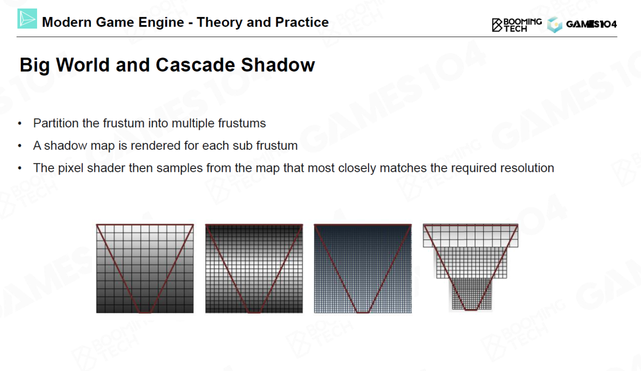 cascade shadow是实时渲染中阴影的经典处理方法。它的思想是根据距离来调整shadow map的精度,近处的精度高远处的精度低。