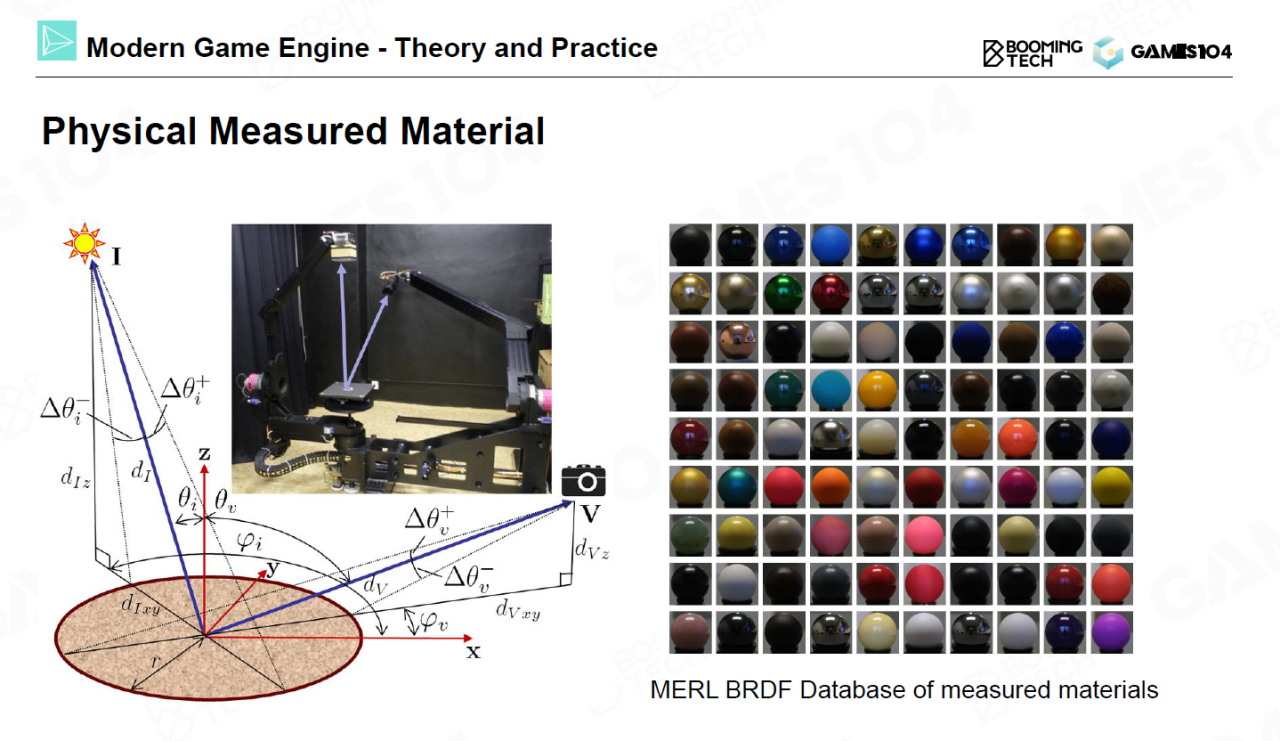 为了获得真实材质的光学参数我们还需要进行实际的测量。MERL BRDF数据库给出了常见材质的BRDF测量结果。