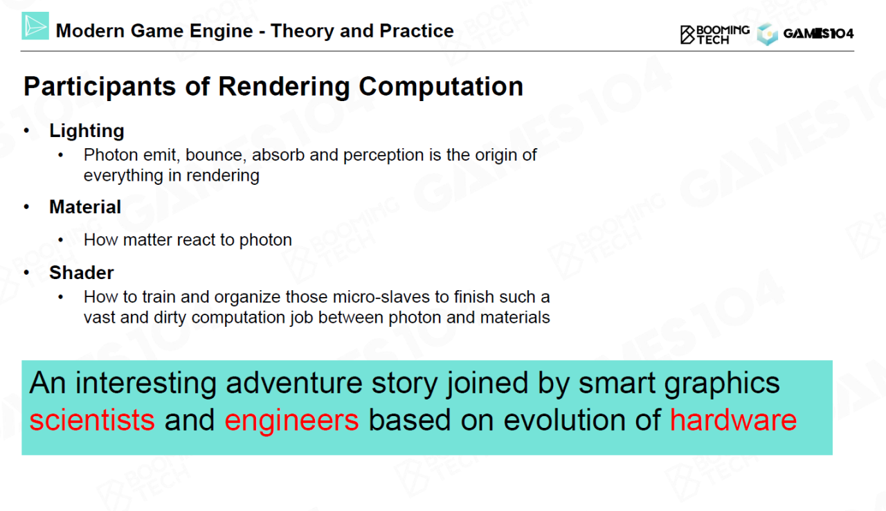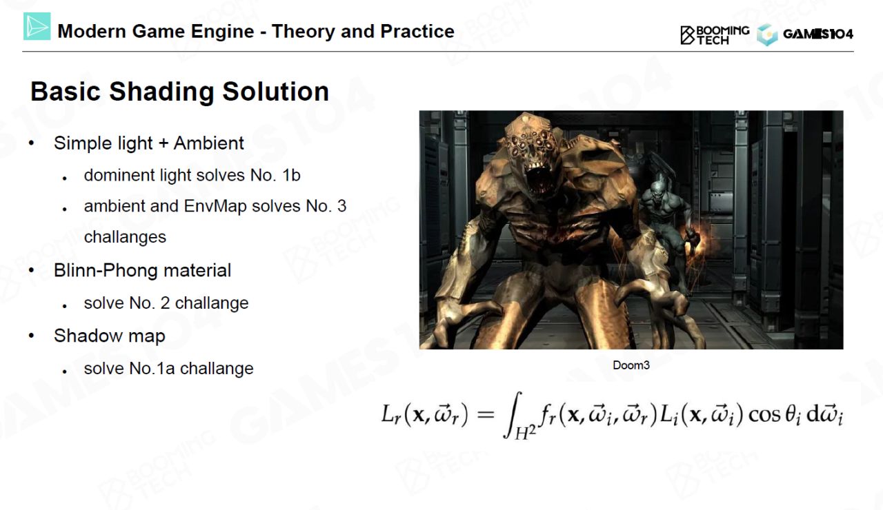 在上一节课中我们介绍了渲染的概念,而本节课我们则会开始介绍游戏引擎中具体的渲染算法。渲染是研究光与材质相互作用的学科,因此本节课从光线、材质以及shader三个方面介绍现代游戏引擎中各种经典实时算法的原理。