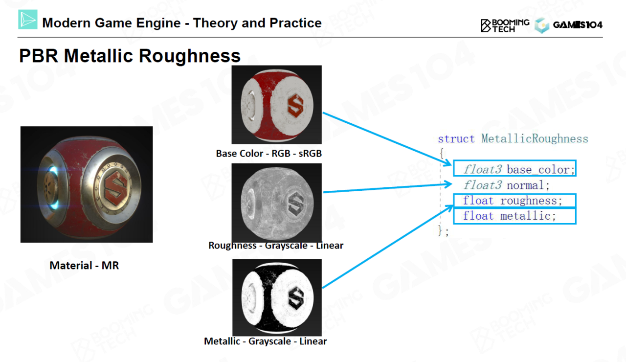 在长期的实践中为了防止美术在设计时出错,人们还对SG模型进行了封装并得到了metallic roughness模型(MR)。MR模型同样包含三张图:一张base color图表示漫反射、一张roughness图表示粗糙度、还有一张metallic图表示材质的金属度。当metallic值很高时材质会更接近于金属材质产生大量的光泽反射,否则会接近于非金属材质以漫反射为主。