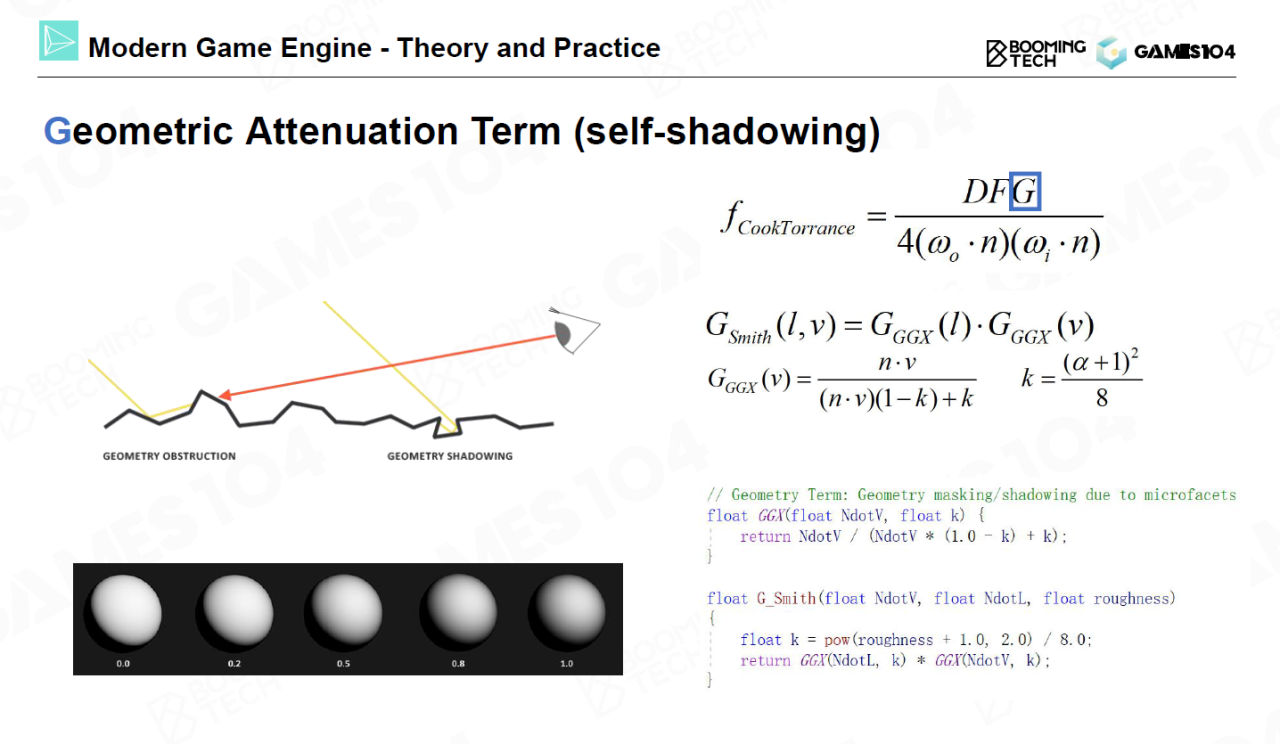 Cook-Torrance模型中的另一项是几何项(geometry attenuation term),它表示不同方向镜面的自遮挡行为。在Cook-Torrance模型中使用Smith模型将几何项分解为出射方向和入射方向两个方向上的可见性乘积,每个方向上的可见性使用GGX模型进行计算。
