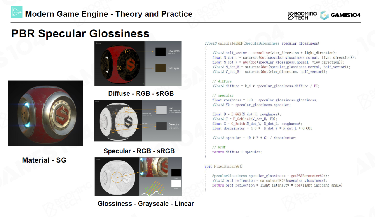 目前在游戏引擎中最常用的材质模型是specular glossiness模型(SG)。在SG模型中物体的反射行为分解为三张图的叠加:diffuse用来控制漫反射、specular图用来控制Fresnel项、而glossiness图则控制金属材质的粗糙度。把三张图带入BRDF计算公式就可以渲染出非常漂亮的模型。
