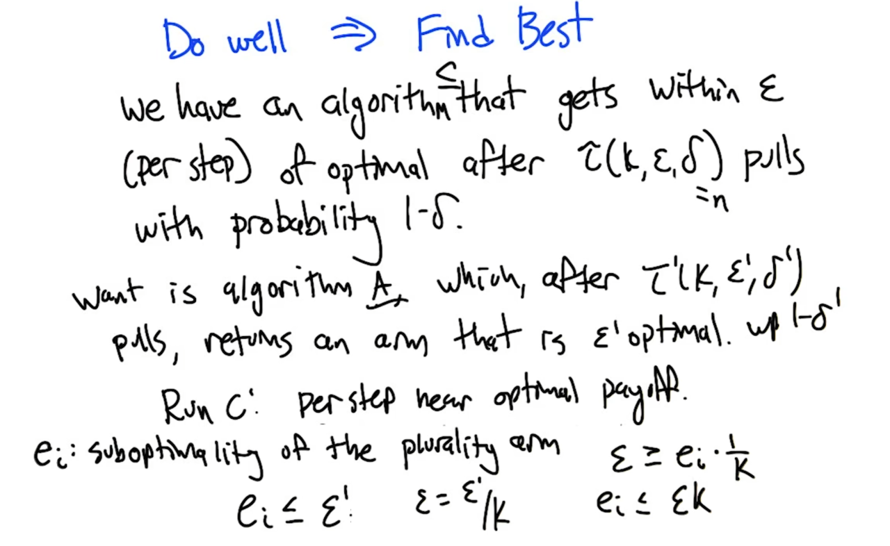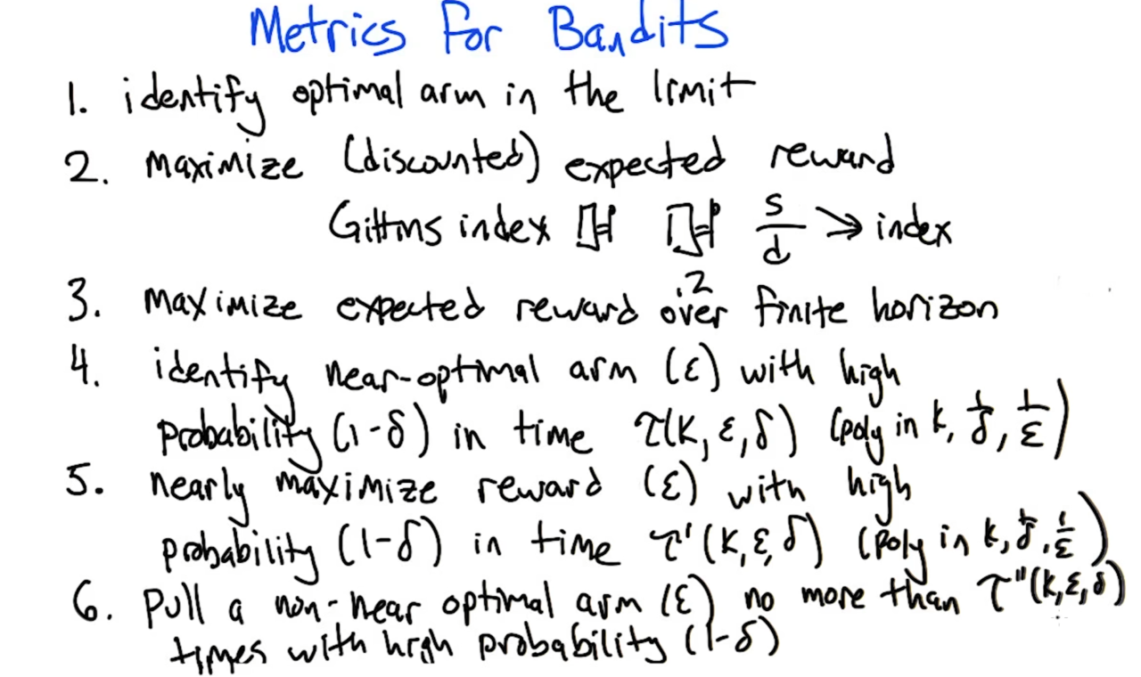 我们需要建立某种指标来平衡智能体的exploration和exploitation行为。这样当智能体基于该指标进行决策时可以找到最优的机器并获得最大累计奖励。有时可能没有办法在有限的探索中计算出最优的机器,但我们希望基于该指标仍然可以在多项式时间内以一个比较大的概率寻找到近似最优的机器。