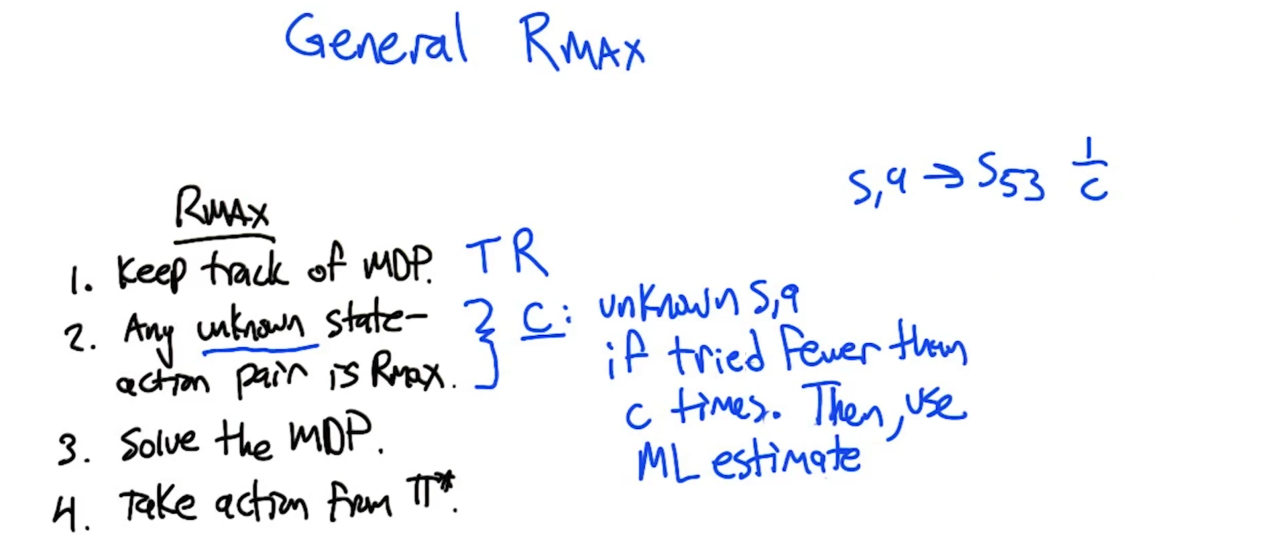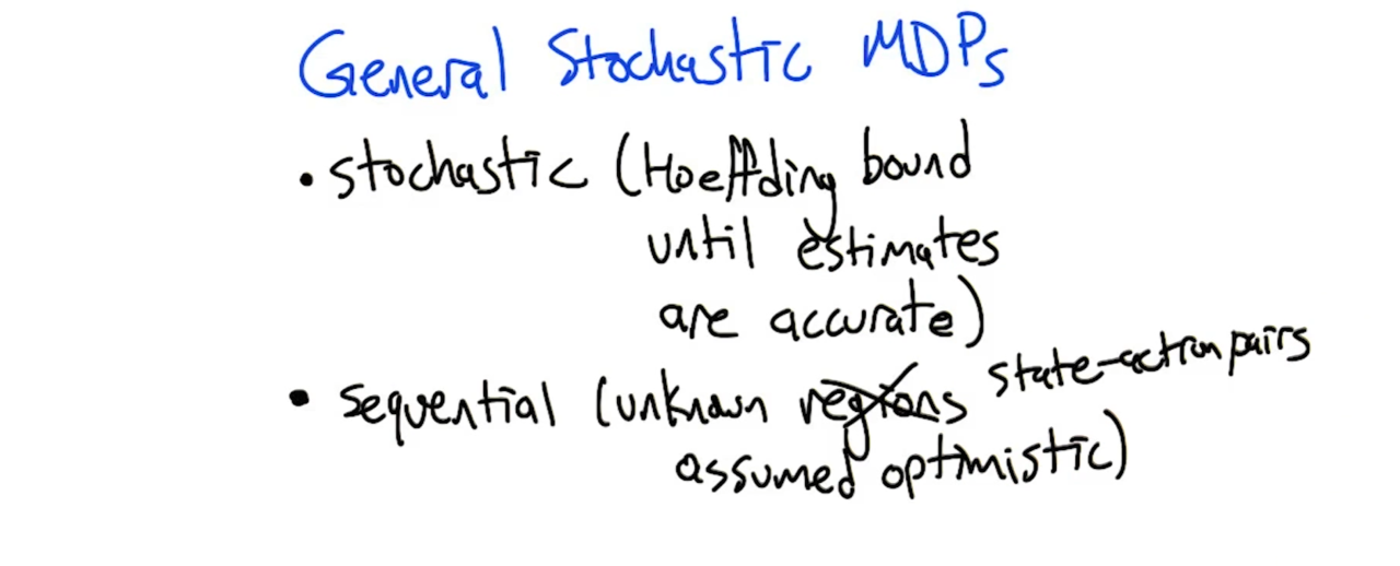 对于随机环境的MDP问题,我们可以把Hoeffding bound和Rmax算法的思想结合起来:对于探索过的状态使用Hoeffding bound来估计,而对未探索的环境则标记为Rmax。这样修正过的算法称为general Rmax。