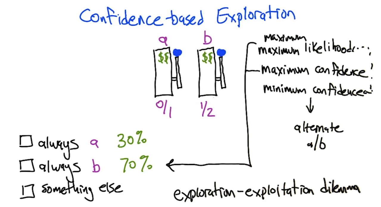 当智能体对每个赌博机进行一定的探索后就可以利用这些经验来选择最优的机器。最直观的方法是利用这些数据来计算每个机器给出奖励的概率,其中概率最大的机器即为智能体的最优选择。显然当观测到的样本数不足时对概率的估计会具有很大的误差,此时智能体的选择往往是错误的。从这个角度上讲智能体在每一次进行决策时需要考虑是否利用当前观测到的数据执行最优策略还是继续对环境进行探索,这样的问题称为exploration-exploitation困境(exploration-exploitation dilemma)。
