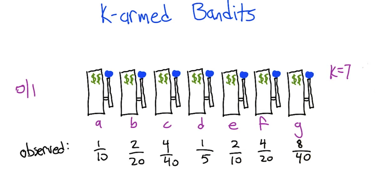 K臂赌博机模型(K-armed bandits)是经典的强化学习问题。在K臂赌博机模型中一共有K个不同的赌博机,每一轮游戏中智能体需要选择其中的一个,然后选择的机器会根据自身设置的概率给予智能体0或1作为奖励。智能体的目标是最大化累计奖励,也即选择回报概率最大的机器。由于智能体对每个机器的奖励概率一无所知,因此它需要首先对每个机器进行探索从而对概率进行建模。