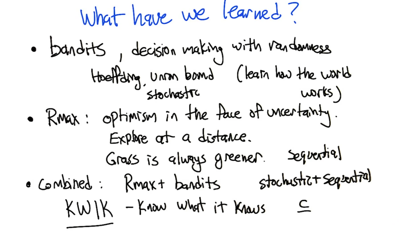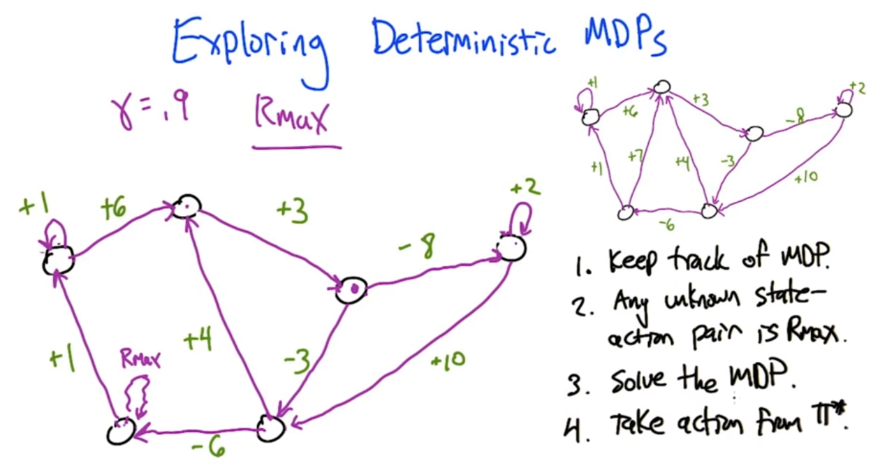 上图中的算法称为Rmax算法,它的思想是把所有未预见的状态-奖励都标记为$R_{\max}$从而鼓励智能体去探索未知的环境。