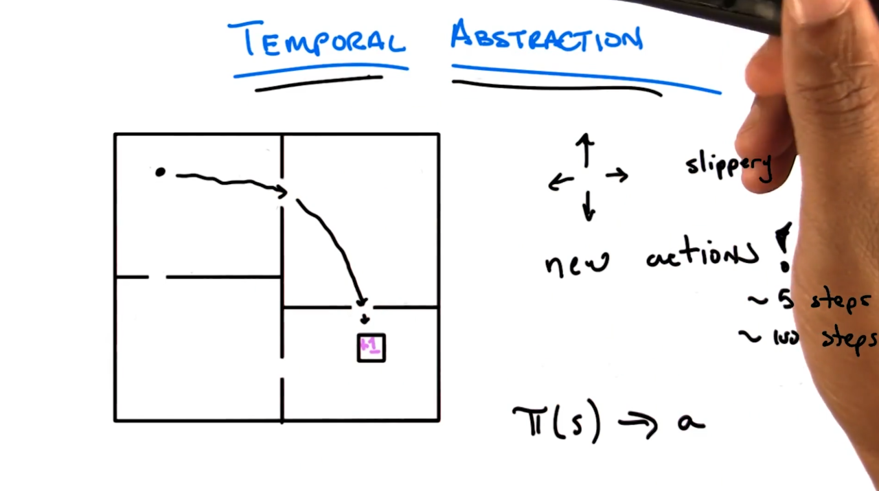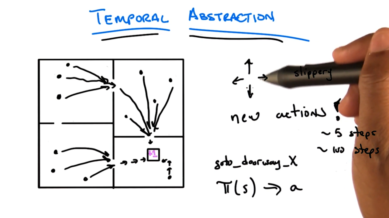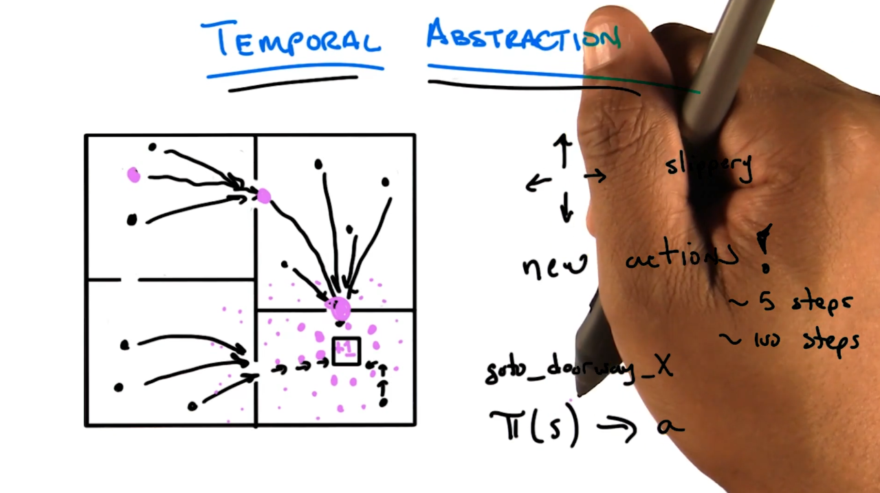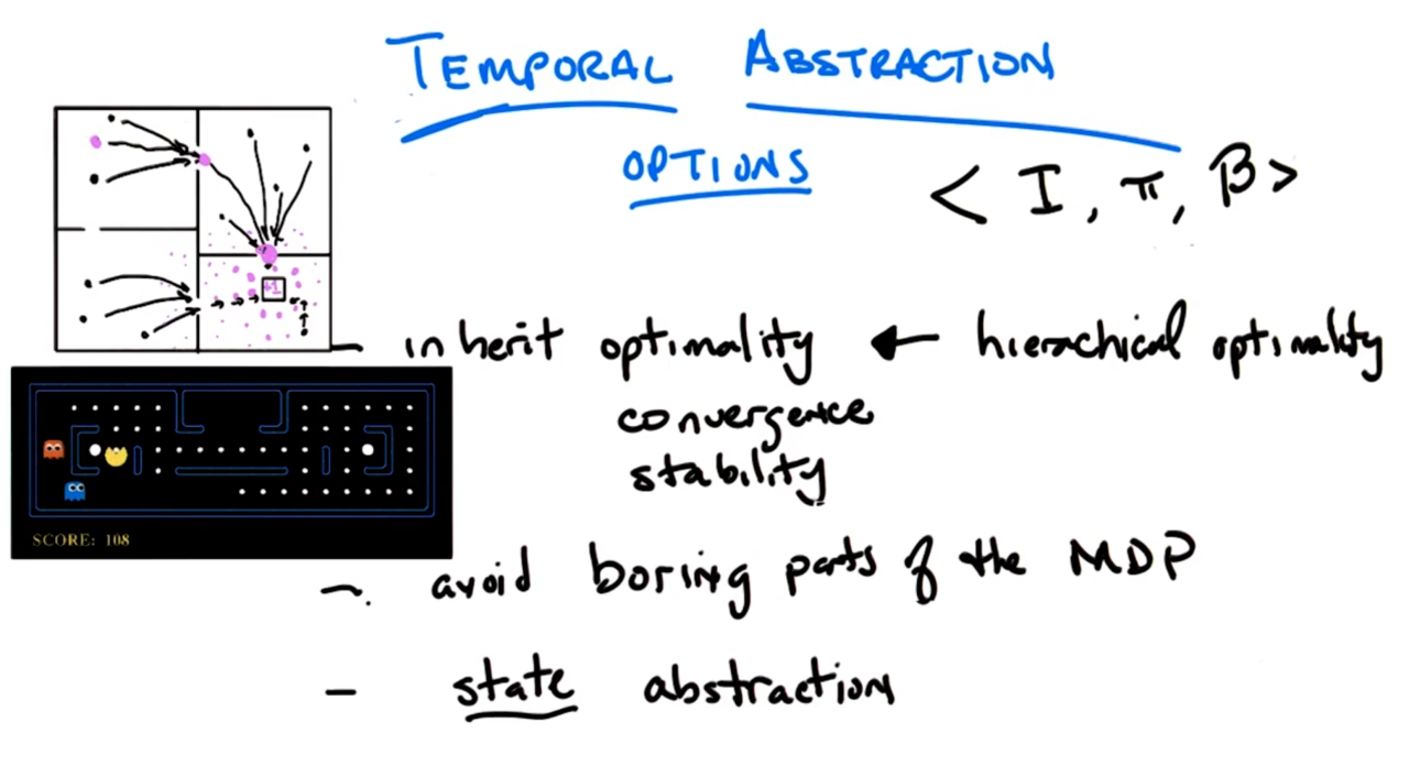 假设智能体位于方格世界中,它的目标是前往右下角的房间并获取奖励+1。这样的问题可以使用强化学习来求解,并得到对应的策略$\pi$。显然,当智能体进行决策时需要把每一时刻的状态输入到策略$\pi$中,这就导致了整个问题的规模无比巨大。而对于人来说,我们不需要考虑所有时刻的状态而是选取某些关键的状态来对问题进行抽象。在本例中,我们可以把策略重新定义为首先移动到右边的房间,然后再移动到下方的房间。这样整个问题就可以使用这些新定义的状态和行为来缩减求解的规模。这样的思想称为temporal abstraction。