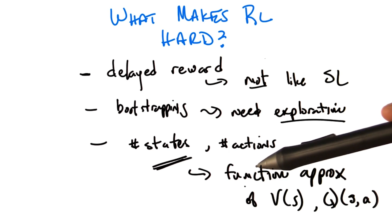 我们首先来考虑一下为什么强化学习比较困难的问题。和监督学习相比强化学习的奖励是滞后的,这意味着我们无法按照函数拟合的方式去学习一个好的策略;另一方面,在强化学习中智能体需要对环境进行探索才能从基类到的经验进行学习;除此之外,强化学习的规模往往是非常巨大的,价值函数的规模同时依赖于状态空间和行为空间的大小。