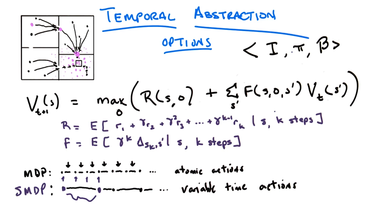 \[F = \mathbb{E} [\gamma^k \Delta_{s_k, s'} \vert s, k \ \text{steps}]\]这样相当于在原始问题的基础上重新定义了一个新的MDP,称为semi-MDP(SMDP)。