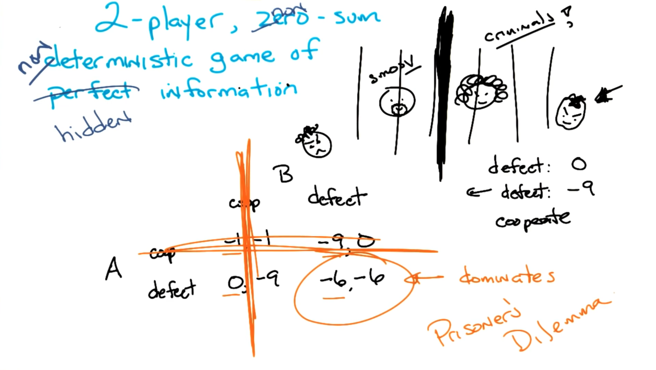 囚徒困境的难点在于当每名囚犯只关注自身的回报时会导致整个系统无法获得最大的整体回报。实际上对于每名囚犯而言他的最优策略都是选择向警方招供,因为此时无论对方如何选择自己招供都会获得更高的回报。但是当两名囚犯同时选择招供时他们的总体收益是远低于选择相互合作的。