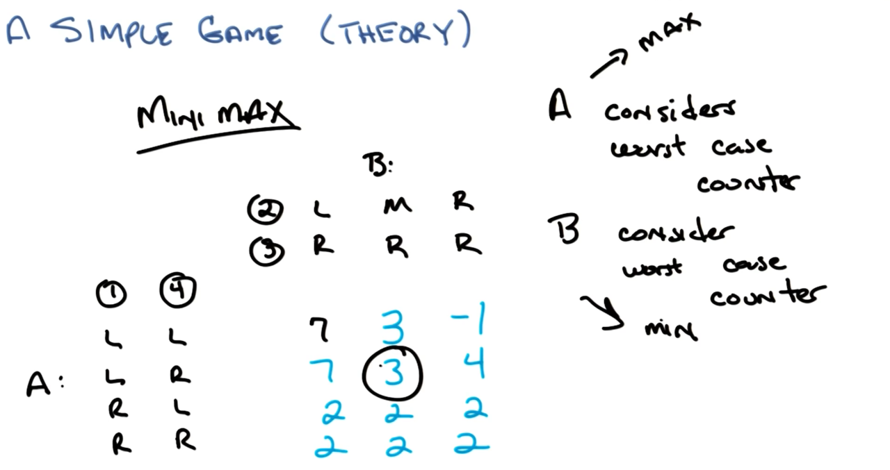实际上我们只需要这样的一个矩阵就可以描述两个智能体之间的博弈问题。由于是零和博弈,智能体a会试图最大化回报而智能体b则会试图最小化回报。此时对于智能体a来说它的最优策略是寻找经过智能体b最小化回报的策略后具有最大回报的那个策略,即在一系列最小回报中寻找其中最大的那个回报对应的策略,这样的算法称为minimax。
