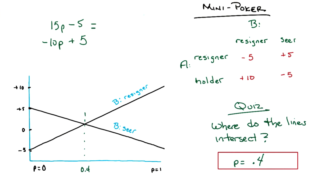 我们进一步计算两条直线的交点可以获得最优混合策略对应的行为概率,在这个概率下无论对方选择何种行为智能体a获得的回报都是相同的同时也是最优的。此时的minimax算法相当于在每个概率上计算两条直线中较小的那个值,然后计算整个概率范围上曲线的最大值。