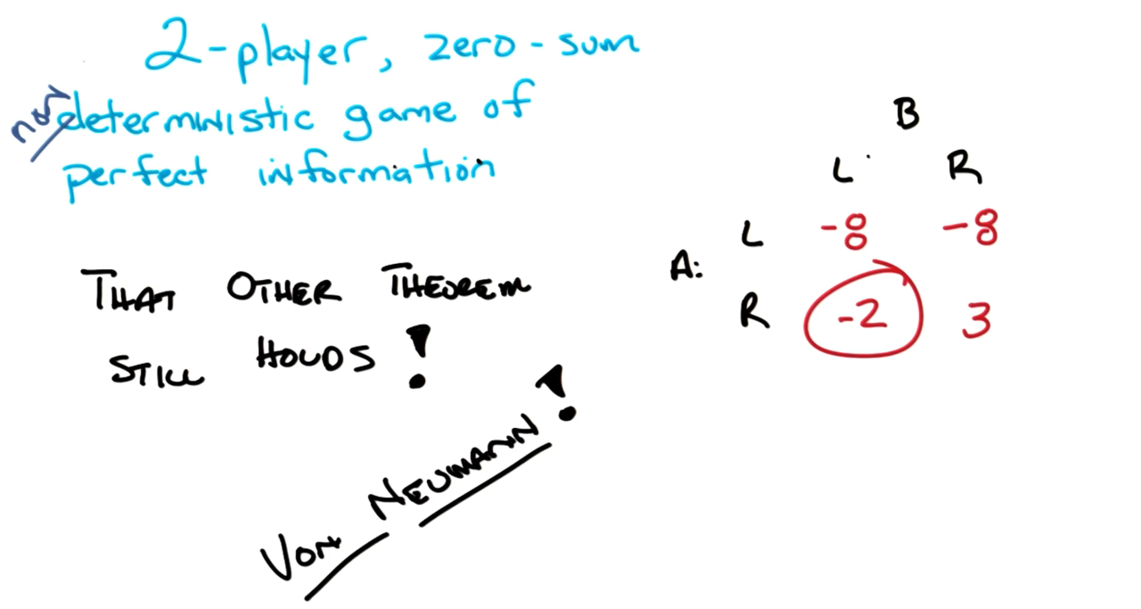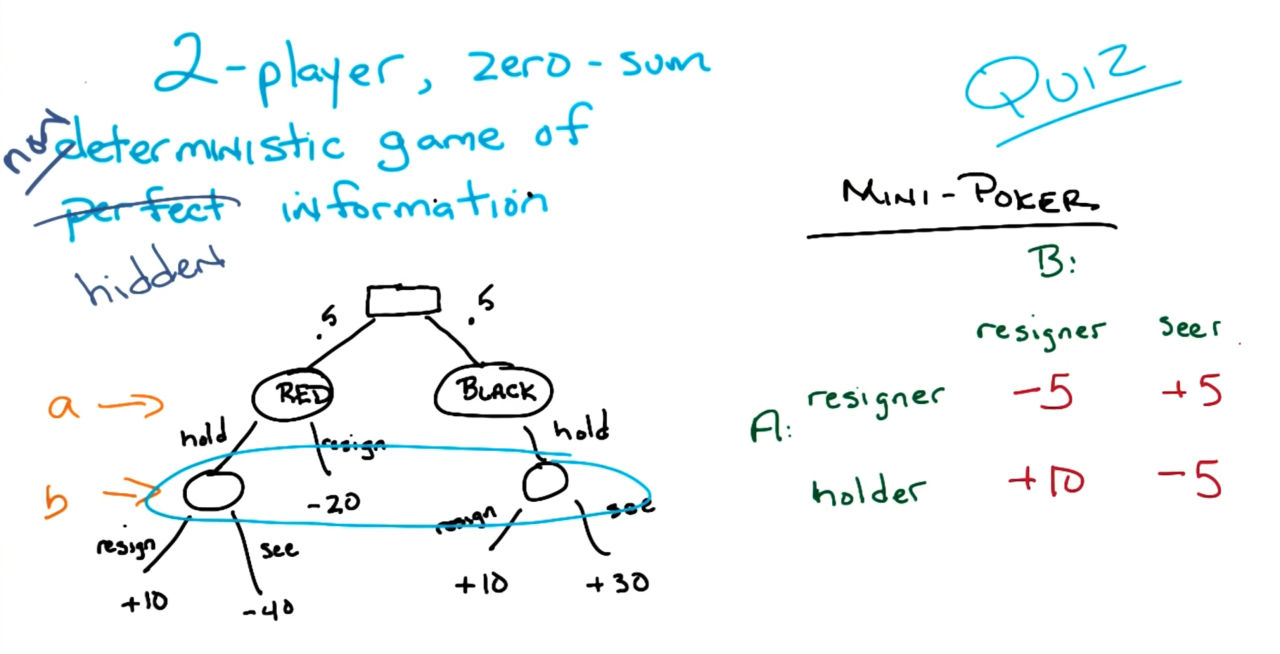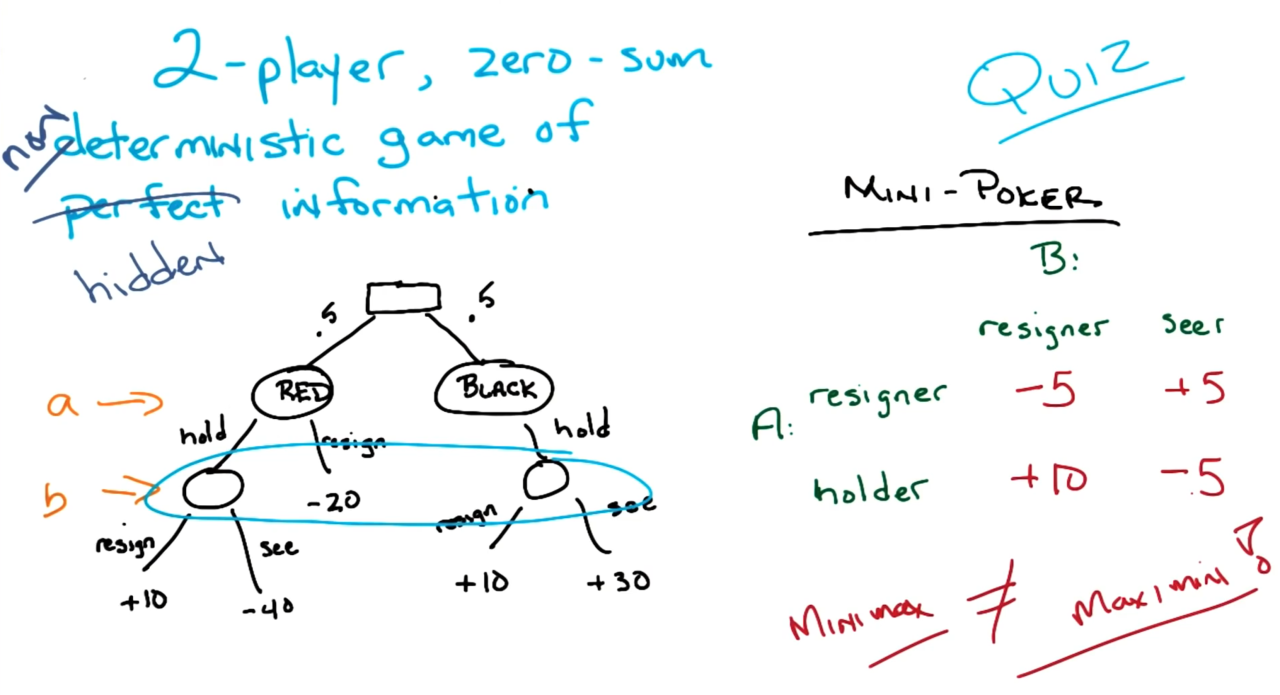需要注意的是由于信息的不完整,两个智能体的最优策略往往是不一致的。换句话说在非完全信息的条件下minimax不等于maximin。