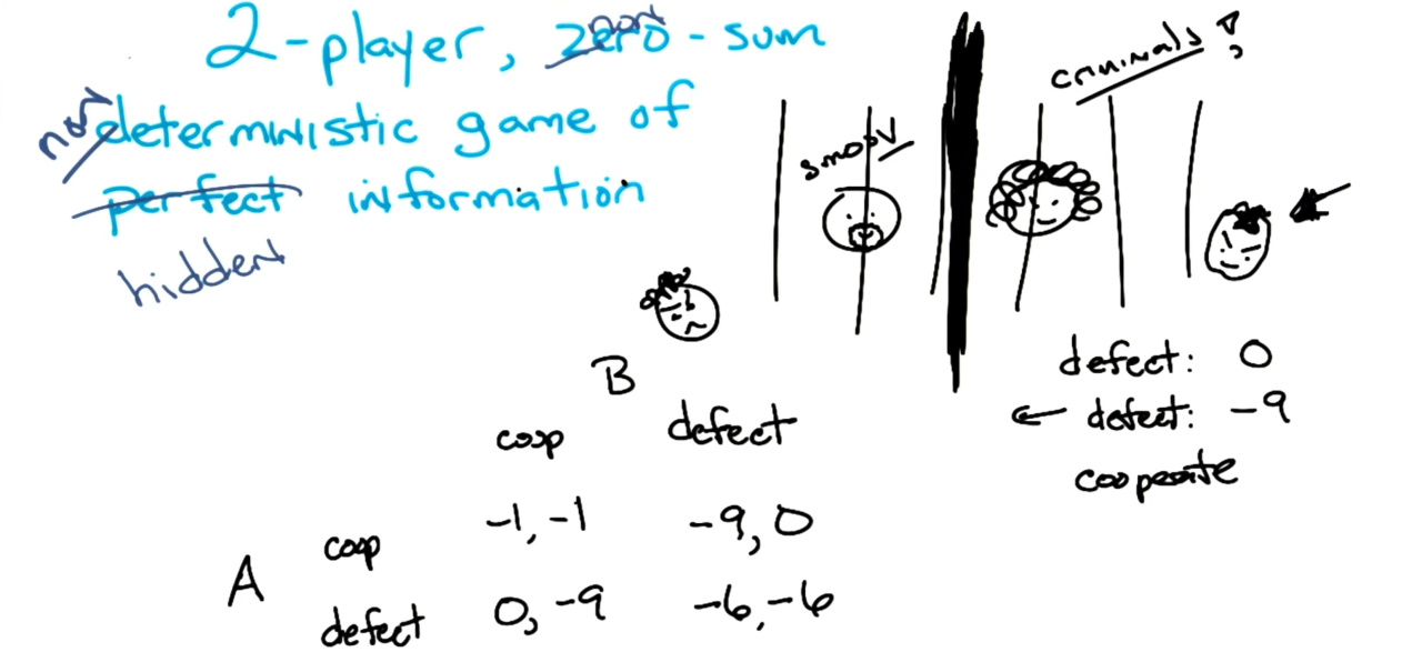 囚徒困境(prisoner’s dilemma)是博弈论中的经典问题。我们假设两名囚犯分别单独接受审讯,他们的刑期取决于是否向警方供认。注意此时整个博弈过程就不再是零和博弈了,我们需要使用一个元组来表示两名囚犯在不同行为(策略)下自身的回报,而每名囚犯也只关注最大化自身的回报。