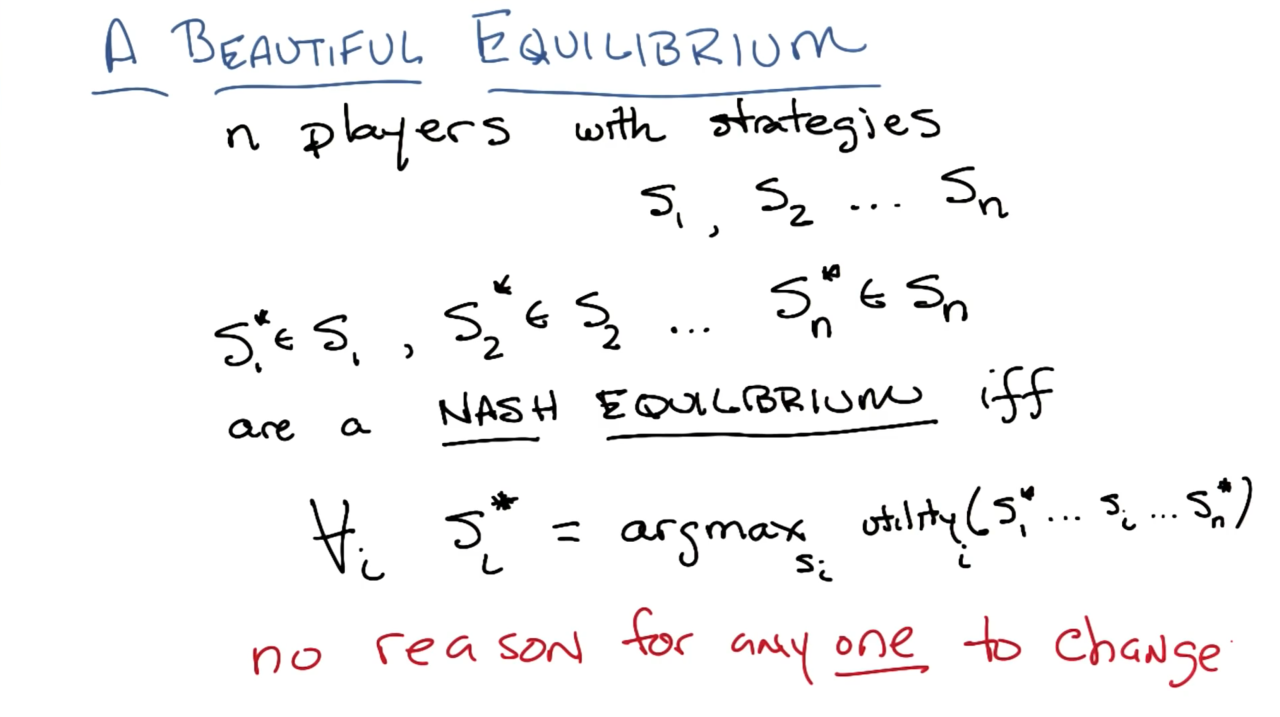 囚徒困境对于更多智能体的博弈问题同样成立,为了更加深入地讨论我们需要引入Nash均衡(Nash equilibrium)的概念。Nash均衡是指在博弈中n个智能体都选择不再改变自身策略的情况,此时整个系统就达到了某种均衡状态。