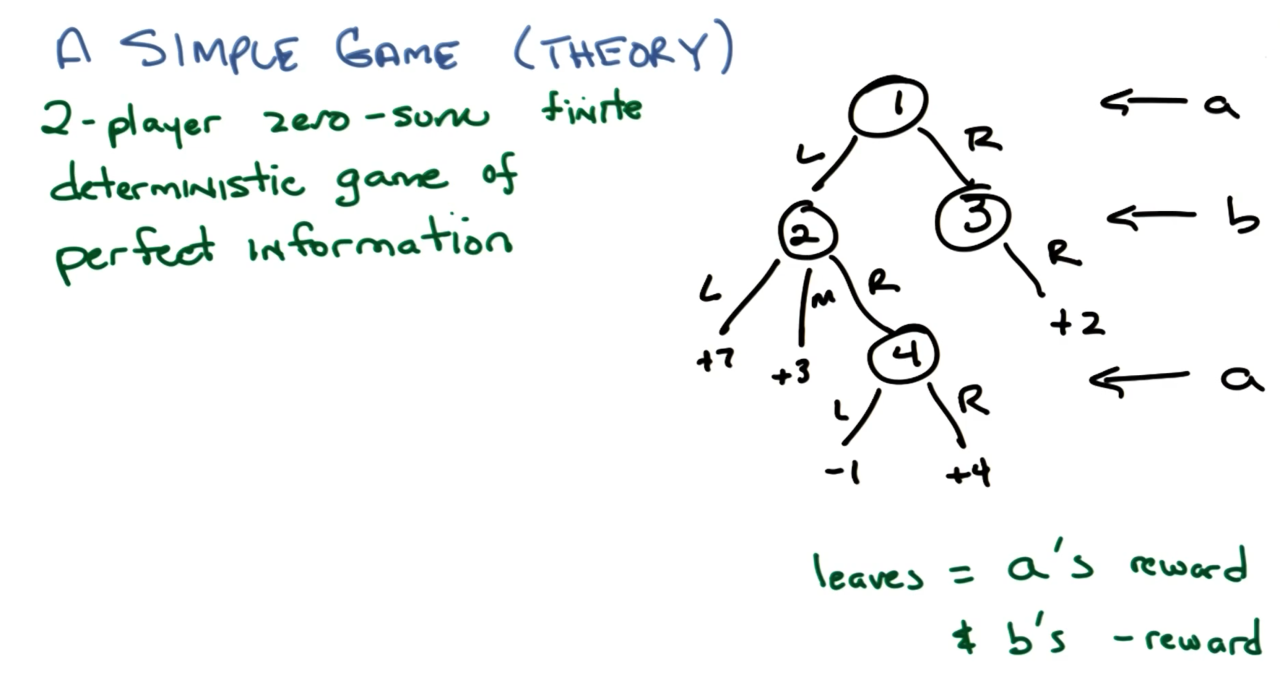 一个简单的博弈例子是考虑两个智能体之间的相互竞争行为。假设环境的状态由a和b两个智能体进行控制且它们按顺序轮流行动,在某些状态下环境会分别基于两个智能体一定的回报。此时a和b两个智能体的所有可行行为可以使用一棵树来进行表示。如果我们进一步假定两个智能体始终知道环境的全部信息且任意时刻它们的累计回报为0,这样的博弈也称为2-player zero-sum finite game of perfect information。