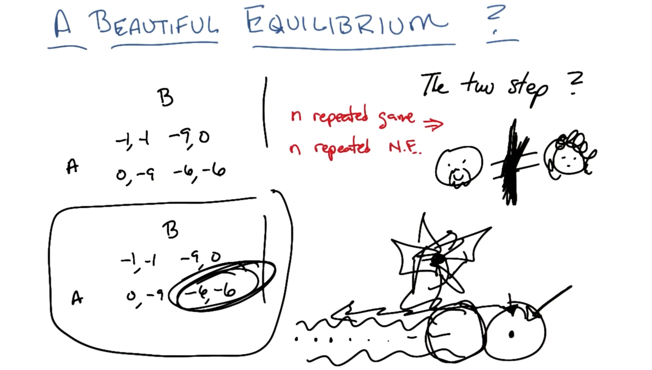 假设两名囚犯现在会进行多轮博弈,在每一轮博弈后会得知另一名囚犯的选择,而且每一名囚犯可以选择对另一名囚犯进行威胁来影响对方的决策。可以证明此时重复博弈的解会收敛到Nash均衡上。