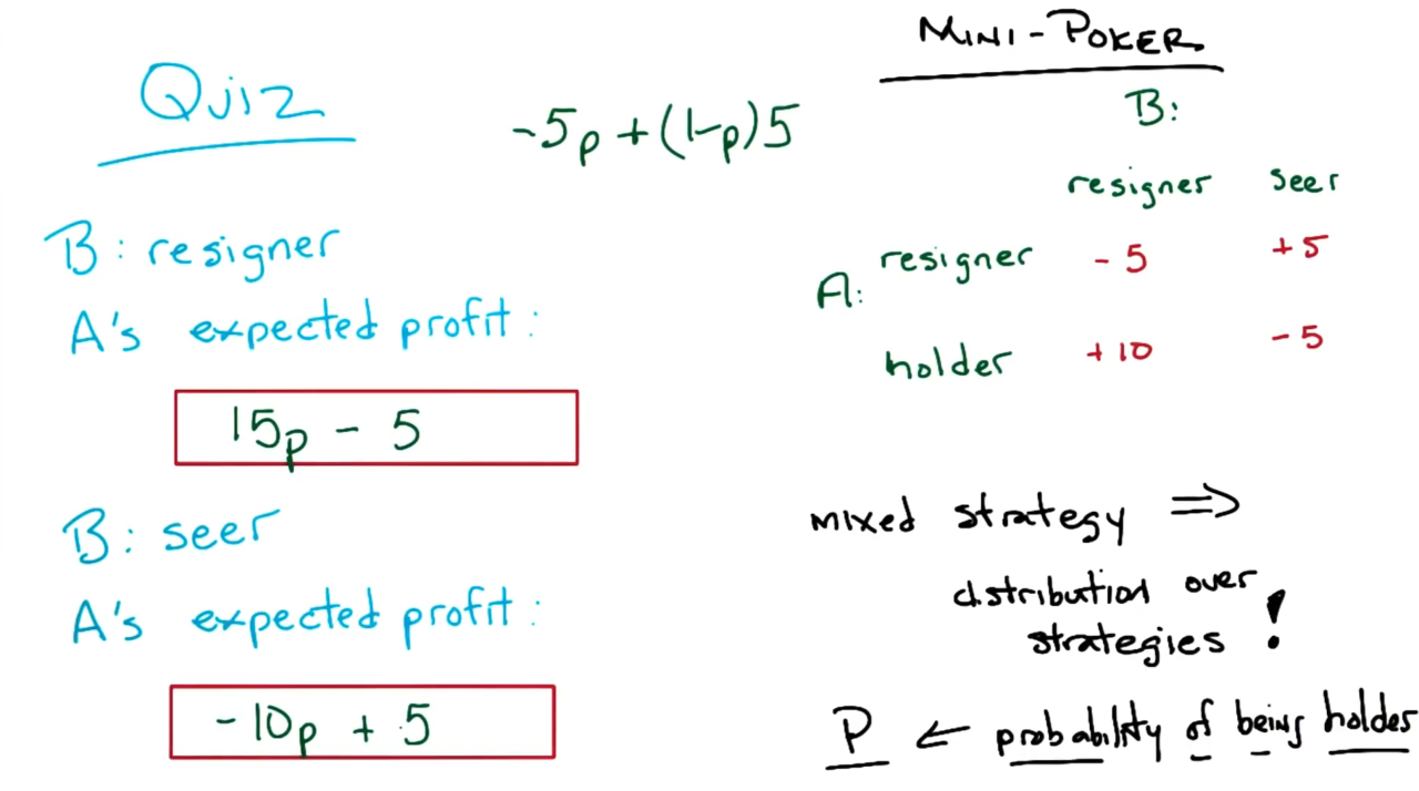 为了处理这种不一致的问题我们需要引入混合策略(mixed strategy)。所谓混合策略是指智能体会按照一定的概率来选择不同状态下的行为,此时智能体获得的回报是关于行为概率的函数。